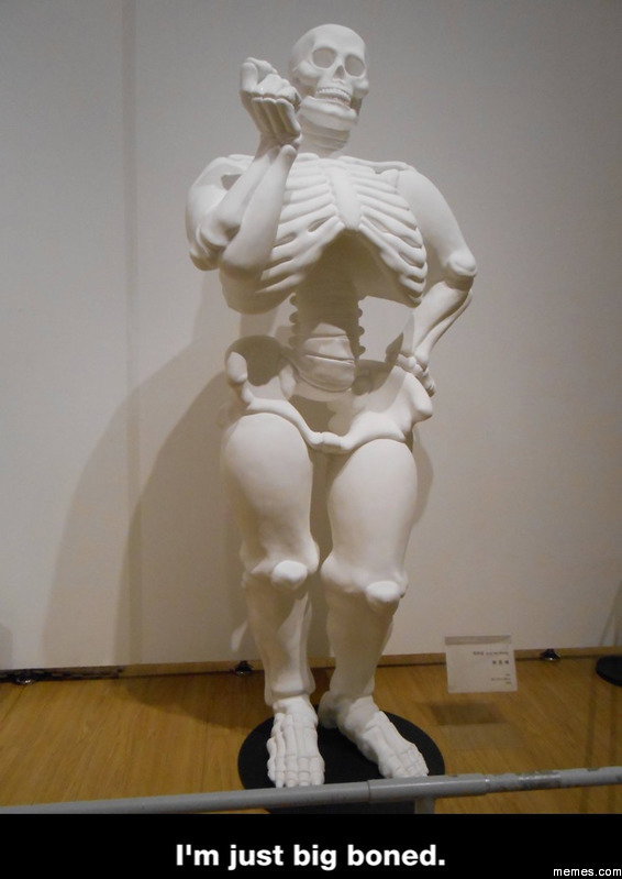 10- Les naïfs qui justifient leur poids par la grosseur ou la lourdeur de leurs os. Ça, ça me fait surtout rire. 🤣🤣🤣 Eille, si jamais t’es pas aussi mince que tu voudrais (c’est pas grave en passant, l’heure est à la diversité corporelle), ben c’est certainement pas tes os qui font une grossee différence sur la balance. Pis d’abord, comment tu le sais que tes os sont lourds ? Y’a tu déjà quelqu’un qui a réussi à les peser sans le reste de ton corps ? Veux-tu me faire croire que si on te dépèce, tu vas ressembler à ça ? Balivernes !