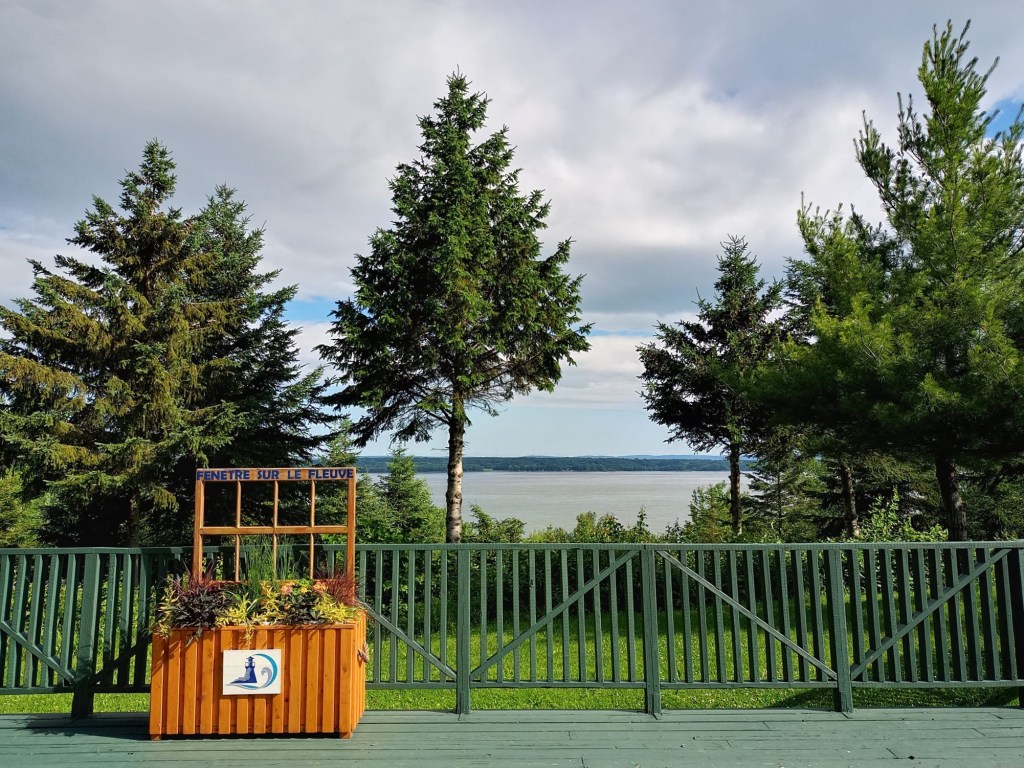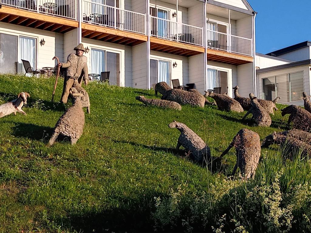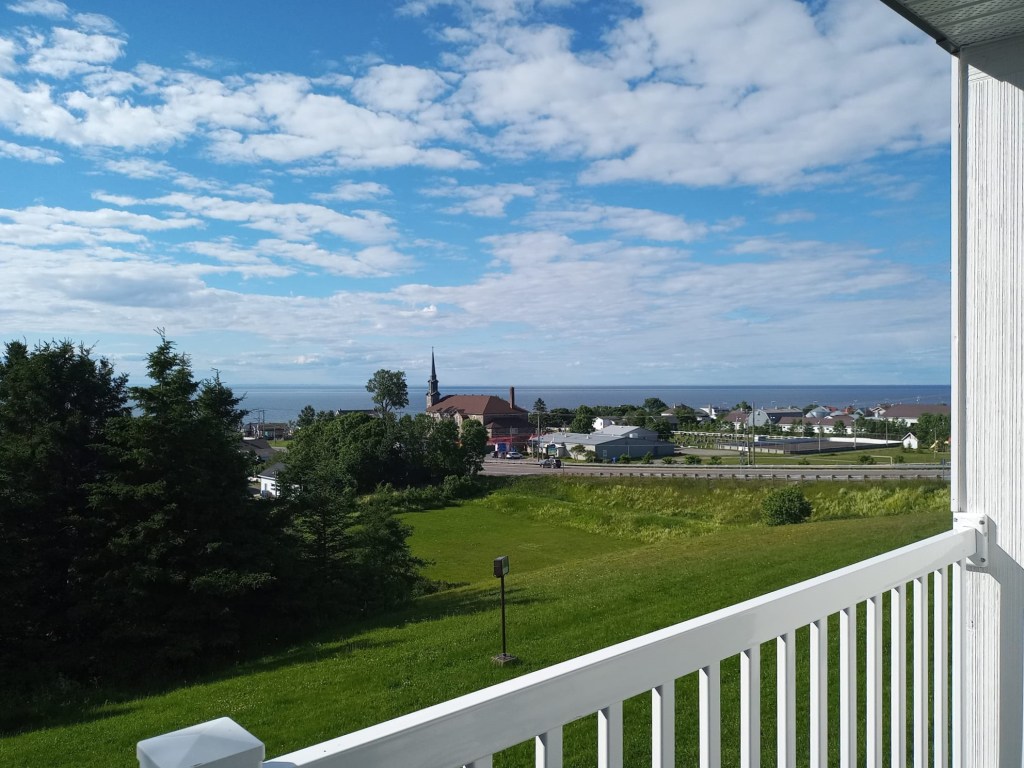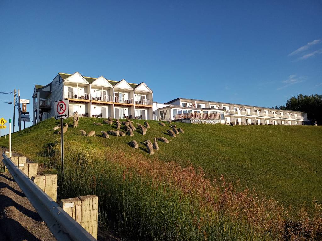 Les derniers 150 kilomètres me semblent un peu plus longs. Heureusement, la route est belle pis je découvre des paysages magnifiques. J’en reviens pas d’être jamais venue par ici avant. Y’était vraiment temps que je me déniaise. 16h45, j’arrive enfin à destination. Je suis crevée. Pour ma première nuit, j’ai pris une chambre avec vue sur le fleuve à Mon joli motel. Quand j’ai fait mes recherches, mon frère m’a dit qu’y réserve souvent des chambres là-bas pour ses employés pis que ça a ben de l’allure. Effectivement, la chambre est plutôt belle pis très propre. Le motel lui-même est sympathique, à l’exception des faux moutons qui jonchent le terrain dans je sais pas trop quel but. De loin, on peut quasiment penser que c’est des vrais moutons mais de proche, y sont épeurants pis le berger aussi.