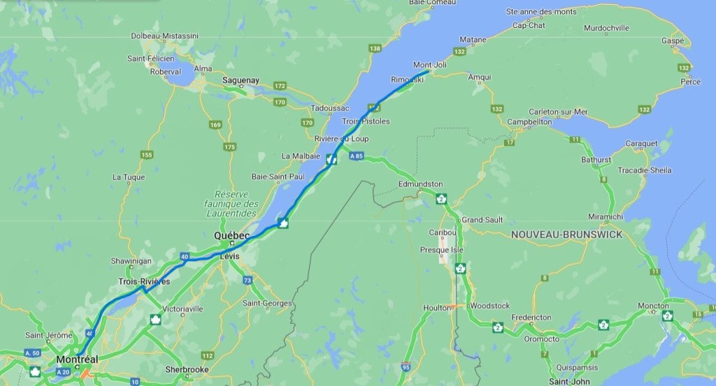 6h30 du matin, me vla donc au volant du KONA, prête à avaler mes premiers kilomètres. Mon itinéraire du jour va comme suit : De Montréal à Trois-Rivières, je prends la 40. Je traverse ensuite le Pont Laviolette pis je switche sur la route 132 jusqu’à mon premier hébergement, juste avant Mont-Joli. Oui, je le sais, je pourrais prendre la 20 d’une traite mais bon, la route fait partie du voyage. En kilomètres, c’est pas beaucoup plus long de passer par la 132 pis c’est ben plus beau. En temps par contre, c’est une heure et demie de plus. J’arriverai quand j’arriverai pis comme je suis tu seule, y’aura personne pour chialer. 😀