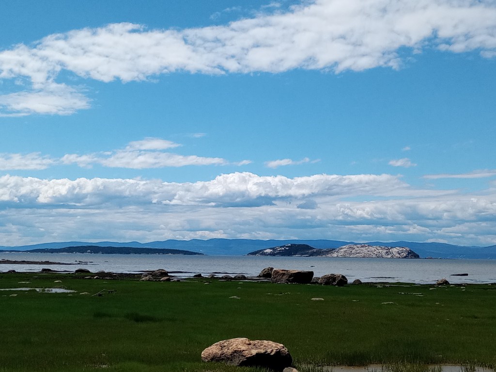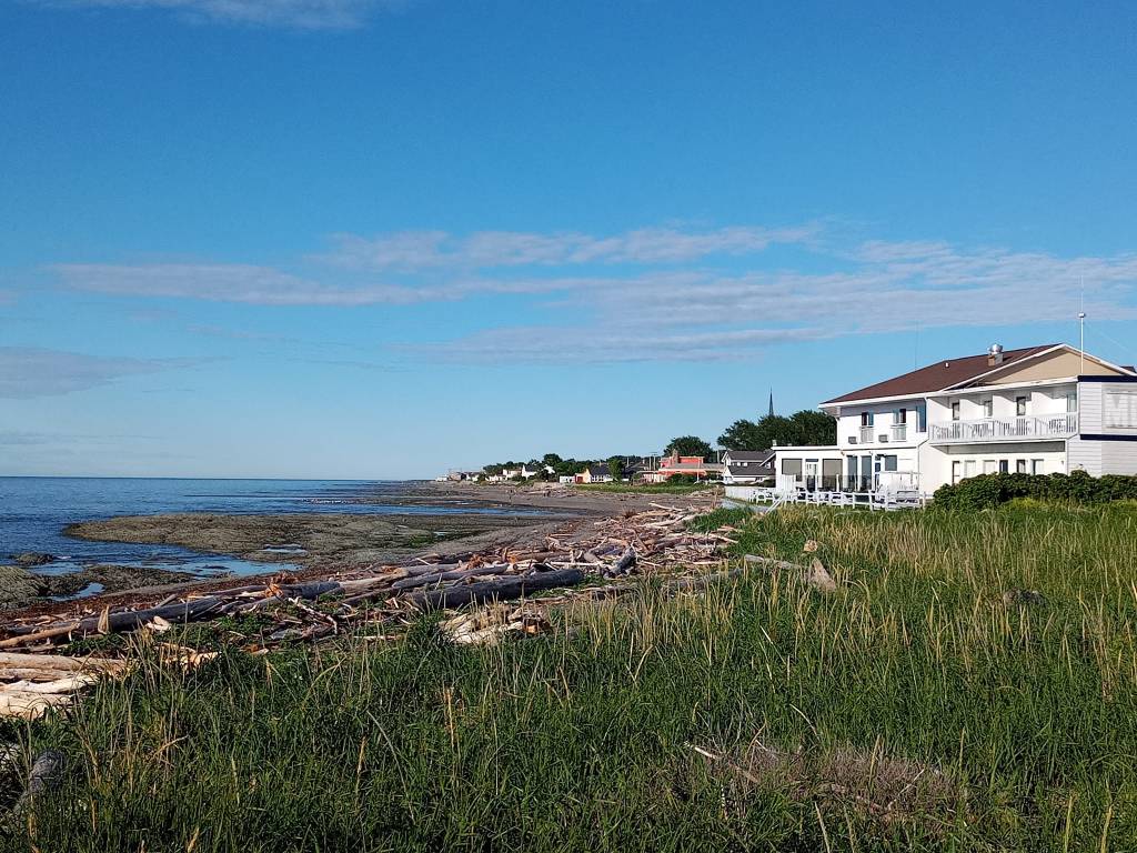 Officiellement, y fait juste 18ºC mais le soleil brille tellement fort qu’on est super bien dehors. Une fois installée à ma chambre, j’en profite pour sortir manger pis marcher un peu. Mon joli motel est à deux pas du fleuve pis de la route 132, qui, à cet endroit, est peuplée de motels pis de petites cantines. J’y passe deux heures à me promener pis à profiter du soleil. Assise sur le quai, je profite du calme pis j’écoute les habitants du coin jaser. Ici, tout le monde a l’air de se connaître pis tout le monde parle français. Je me sens dépaysée. Ça sent la mer. Fernand est en train de pêcher. Y se fait demander au moins dix fois : « Pis, ça pogne tu à soir Fernand ? » Je l’entends dix fois répondre qu’à soir c’est pas vargeux mais que lundi, y’a pogné un bar rayé. Tout le monde a l’air ben content pour Fernand. Même moi, je suis contente pour Fernand. 🙂