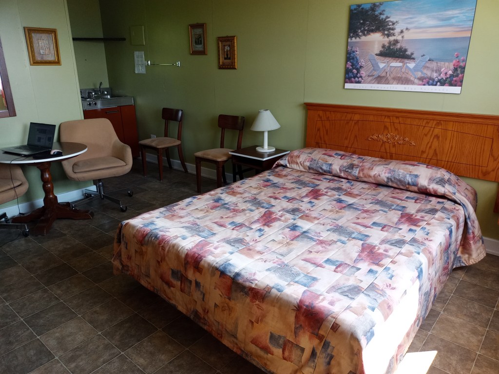 Pour me rendre à Rivière-du-loup, j’ai encore 90 km à faire sur l’autoroute 85. Petit imprévu, sur la moitié du trajet, on roule à une voie seulement, en face à face, à cause de travaux sur la route. À 80 km/h plutôt que 120, mon trajet est finalement pas si gagnant que ça. Pour ma dernière nuit, j’ai loué une chambre au Motel Bellevue. J’ai choisi ste Motel-là pour son emplacement paisible pile devant le fleuve mais je sais d’avance par les photos sur internet que la chambre va être moche pis je m’en fiche. Cette chambre-là, c’est juste pour me laver pis me reposer un peu avant de repartir tôt demain matin. Quand je l’ai réservée, je m’étais dit que j’apprécierais la quiétude des lieux après cinq jours de cavale. Arrivée sur place, je peux confirmer après une reconnaissance des lieux que Bellevue s’applique au dehors et non au dedans. Les murs de ma chambre sont verts marde, les meubles bruns, le vieux couvre-lit fite pas avec les rideaux pis les trois-quatre décorations sont kitch. De toute beauté. 😁 Heureusement, l’endroit est propre pis l’emplacement est très calme. Comme promis, j’ai une belle vue sur le fleuve. Bon, c’est sûr que quand tu viens de passer trois jours avec le Rocher Percé dans ta fenêtre de chambre…