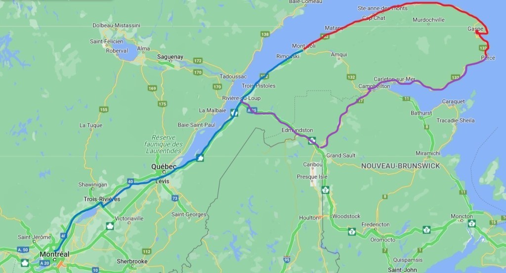 Quand mon réveil sonne à 6h. à matin, je suis en train de rêver que je suis de retour chez nous pis que Charlot me reconnaît pu. Ça doit être signe que c’est le temps que je rentre. D’ailleurs, je viens de passer ma dernière nuit à Percé. C’est drette là que je dois quitter à regret mon petit coin de paradis. Aujourd’hui, j’ai environ 500 km à faire. Mon but est de repartir par la Baie des chaleurs pis de couper dans le Nouveau-Brunswick pour aboutir à Rivière-du-loup. En passant par là, j’économise une cinquantaine de kilomètres. En plus, je suis jamais allée au Nouveau-Brunswick. Ça sera sommairement fait. 😀