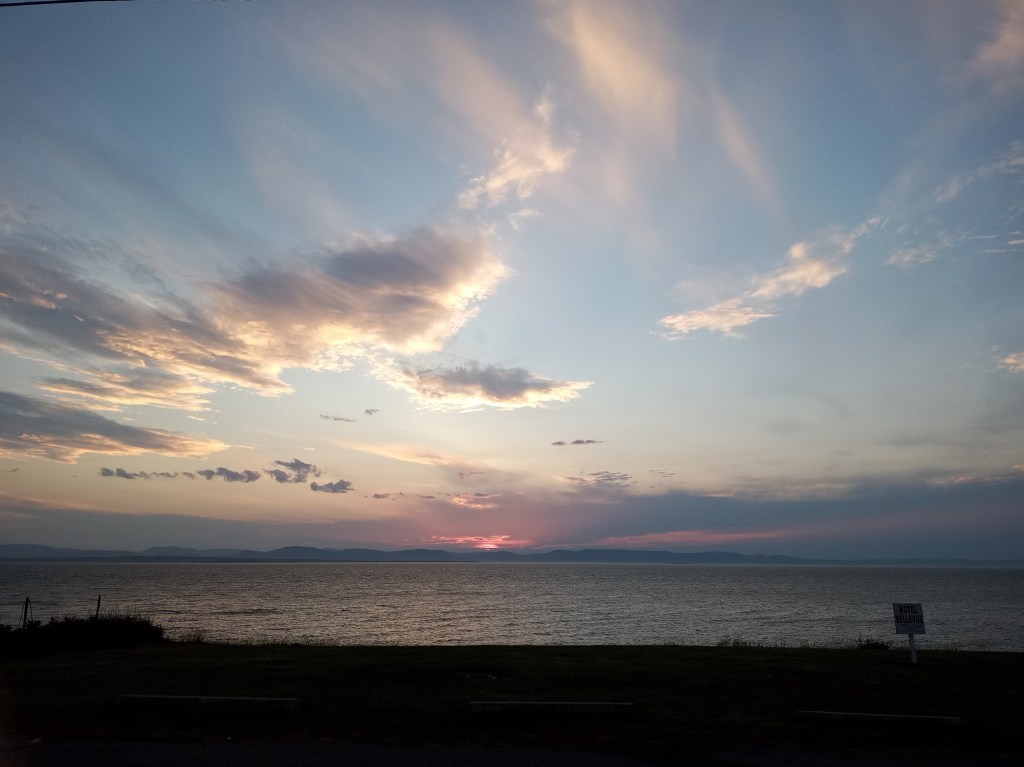 Je retourne sur la route 132 pis je rentre dans le premier resto que je vois, un Normandin. Je commande une demi-portion de lasagnes suprêmes qui viennent en combo avec une salade césar. La fille se trompe dans ma commande pis m’apporte les lasagnes « normales ». La salade césar est pas ben bonne. Je suis fatiguée, j’ai faim pis j’ai pas le goût de chialer. Je mange, je paie, pis je repars un peu en maudit. Au retour, je m’asseois dehors pour profiter un peu du soleil pis de la vue. Y fait pas chaud chaud pis c’est relativement venteux. Je prends quelques photos du coucher du soleil pis je rentre dans mon palace pour la nuit.