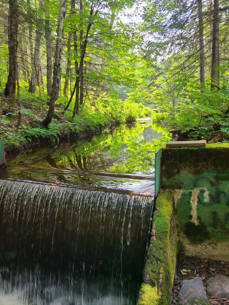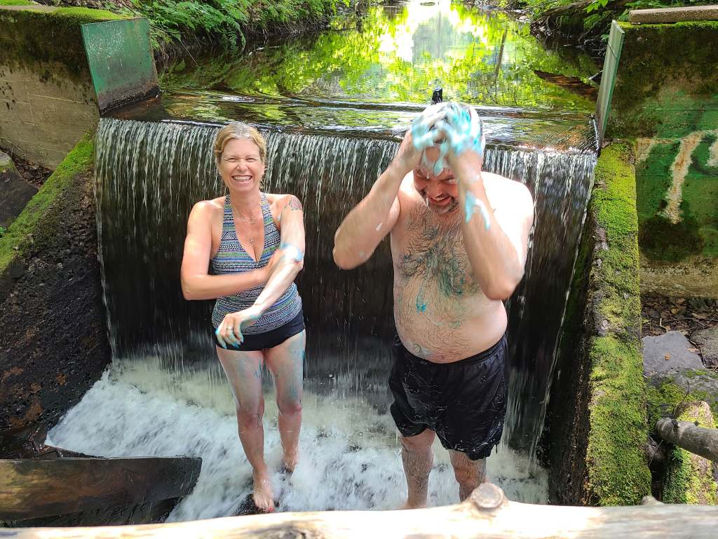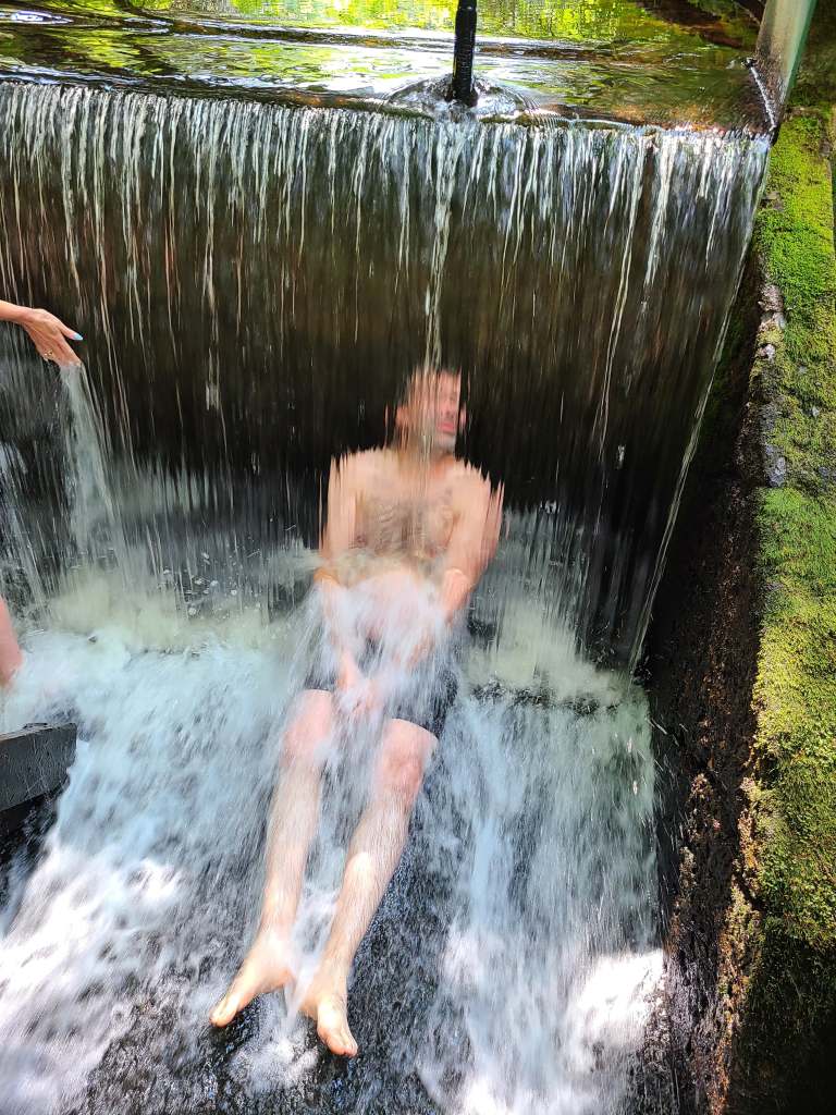Après un peu de viraillage dans le village pis autour du barrage, on reprend finalement la route du retour non sans un dernier petit arrêt mais non le moindre. J’ai mentionné tantôt l’activité « aquatique » ? Ben la vla. Il s’agit de la douche en plein air, douche aménagée par les campeurs du coin à même une cascade d’eau. Depuis qu’on l’a découverte vla quelques années, la douche est devenue LA raison majeure du périple familial. Aie pis on niaise pas quand on prend notre douche là-dedans ! Cette année, mon frère innove même en se brossant les dents dans la cascade. On est vraiment crampés. L’an prochain, on emmène du bain moussant pis pouquoi pas nos rasoirs. 😁😁😁