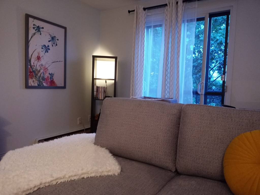 En avril-mai, j’ai repeint en gris, tous les murs de mes couloirs pis de ma salle à manger auparavant beiges pâles. Après treize ans dans st’appartement-là, c’était pas un luxe même si ma foi, y’avait pas grand chose de scratché. Comme c’est prévu que je fasse aussi ceux du salon, le mardi matin, je me dis que je serais ben folle de pas profiter du fait que j’ai pu de divan pour repeindre. Aussitôt pensé, aussitôt fait. Je déménage tous mes meubles de salon dans ma chambre, je lave les murs, bouche les trous, pose du masking tape pis donne une première couche par un beau petit 28ºC. Le mercredi, en fin de matinée, mon amie Sylvie me débarasse de mon viel arbre à chat. De mon côté, je donne ma deuxième couche de peinture pis le jeudi, je rapatrie mes meubles dans la pièce, tout ça sous une chaleur pis une humidité croissantes.🌞Entre-temps, comme j’ai toujours pas de divan, j’écoule des soirées paisibles sul balcon : musique, vino, sudoku, chat. Le vendredi, le divan arrive en matinée. Je le déballe, l’assemble, pis je pars sur la rive-sud pour magasiner des nouveaux cadres avec William qui est en congé On finit ça par une petite marche au parc Michel Chartrand.