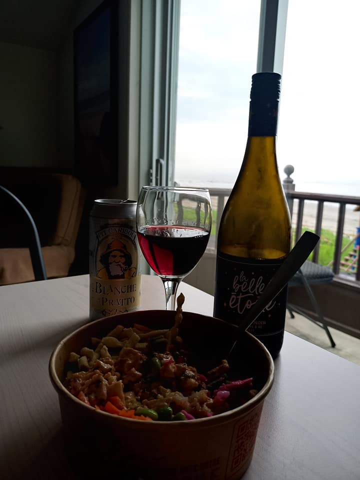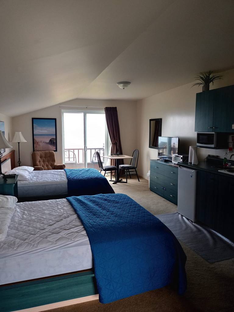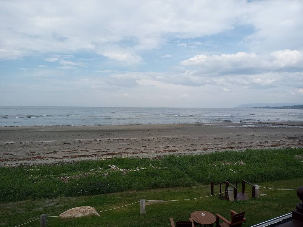 15h30, je me pointe à mon deuxième hébergement : les Cabines Goémons. C’est drôle parce que mon père m’a nommé cet endroit-là l’autre jour, sans même savoir que j’avais réservé là. Apparemment, yé allé vla une quinzaine d’années pis y’avait trouvé ça ben correct. J’ai pas de misère à le croire. Ma chambre a tout le confort souhaité, incluant une mini-cuisinette. Quant à la vue, je pourrais pas vraiment demander mieux. J’ai quasiment peur que les vagues rentrent dans ma chambre ! Fouillez-moi pourquoi par contre, je dois faire mon lit tu seule avec les draps propres placés dans le tiroir. J’imagine qu’y sont tannés de faire deux lits pis d’être pognés pour changer les deux sans trop savoir si y’ont été utilisés. Je vois pas d’autre raison… Anyway, une fois installée, je google pour voir si y’a pas une épicerie pas loin. Me semble que je mangerais des légumes avec une bonne bière frette, d’autant plus que mon dîner d’aujourd’hui s’est encore résumé à une barre tendre, inquiète que j’étais que la pluie compromette ma journée. Sur Google map, je repère un Métro à 12 km. J’y fais un aller-retour pis c’est victorieuse que je reviens à ma cabine avec mon butin. La soirée va être tranquille. Demain, je poursuis ma route.