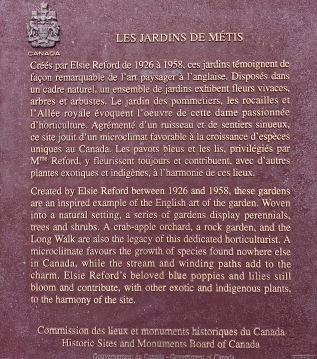 Vers 8h45, je quitte Mon joli motel pour me rendre aux Jardins de Métis, à seulement 10 km de Ste-Flavie. L’été dernier, j’étais passée devant mais y’était 6h30 du matin pis fallait que je roule jusqu’à Percé. Cette année, je suis moins en rush. J’ai beaucoup entendu parler de ces jardins-là pis je veux les voir. D’ailleurs, rendue sur place, je mets pas longtemps pour me féliciter de mon choix. Les jardins sont extraordinaires pis représentent tout ce que j’aime : des arbres, des fleurs, un ruisseau, des sentiers, du grand air, un bord de mer, des chants d’oiseaux pis de la marche à profusion. Ah pis, y’a de l’histoire aussi parce que les Jardins de Métis, ça a pas été créé par n’importe qui ! En visitant le musée, je découvre que ce magnifique endroit est l’oeuvre de Elsie Reford, une dame issue de la bourgeoisie anglophone pis passionnée de jardinage. Elle a mis, figurez-vous donc, 32 ans (de 1926 à 1958) à imaginer pis paufiner l’endroit. Elle a aussi habité, avec son mari, Robert, (Reford et non Redford), l’IMMENSE manoir de 37 pièces qui tient aujourd’hui lieu de musée. La résidence, on ne peut plus somptueuse, témoigne de la richesse pis du bon goût de Madame Elsie. C’est vraiment à regret que je quitte l’endroit en fin de matinée après en avoir fait le tour deux fois plutôt qu’une. Toute bonne chose a une fin semble-t-il pis yé temps que je me rende sur le site de ma deuxième activité, 120 km plus loin. 🚗