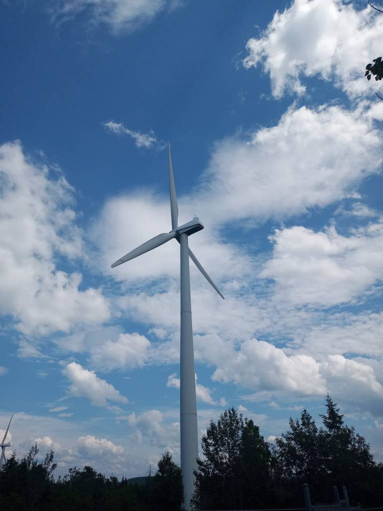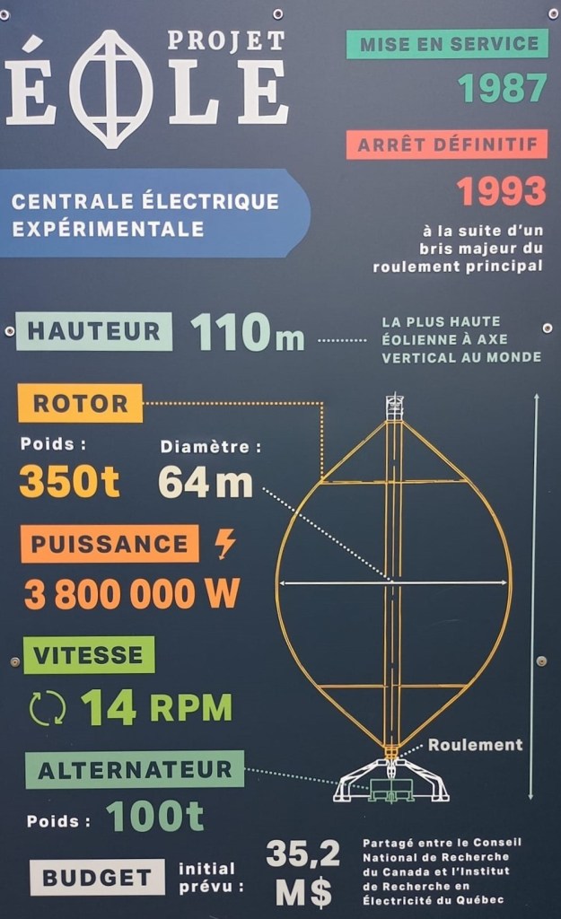 Le Projet Éole, c’est un autre endroit que je tenais vraiment à visiter. Ste site-là, c’est un parc de 76 éoliennes mais ce qui le rend unique, c’est qu’on peut y voir LA plus haute éolienne à axe vertical au monde ! Oui mes amis ! Pis je vous jure que c’est impressionnant pas à peu près. D’ailleurs, mes pauvres photos sont loin de rendre justice à l’IMMENSITÉ de la chose. Le pire dans tout ça, c’est que cette extraordinaire éolienne-là a été en fonction uniquement pendant six ans, soit de 1987 à 1993. Tout ça, pour la modique somme de 35.2 millions de dollars. Gaspillage vous pensez ? Ben non. En visitant le site, je découvre qu’une éolienne, ça dure pas longtemps. En plus, celle-là, c’était un projet de recherche pis à ce titre, y semble que l’investissement en valait la peine. Pour votre information d’ailleurs, tous les parcs éoliens ont une durée de vie. Après un certain temps, les éoliennes deviennent désuètes (et non des juvettes hein François ? 😂 ) pis le parc est démantelé, tout simplement. Celui que je visite devrait cesser ses opérations en 2033. Y vous reste dix ans pour le visiter.