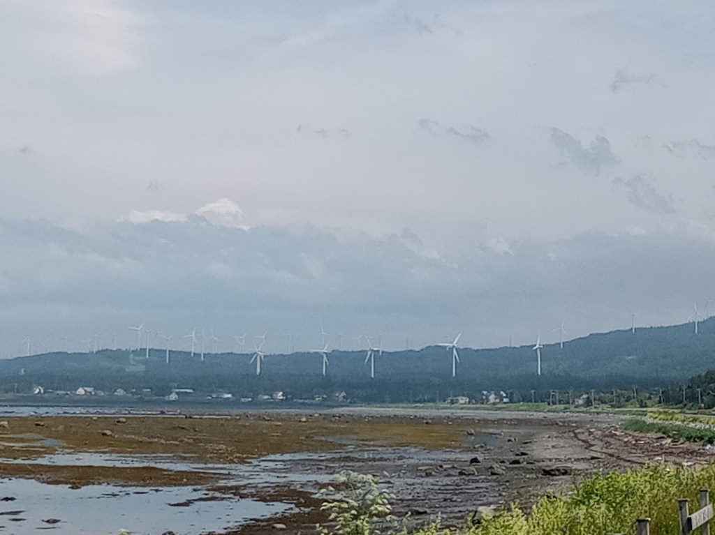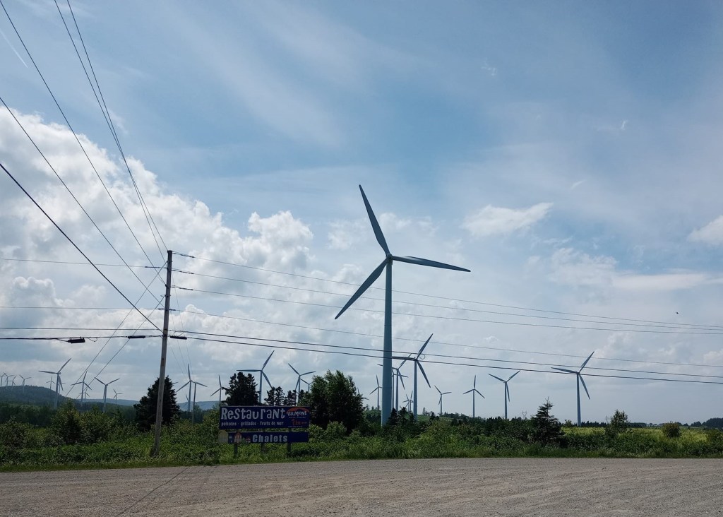120 km à rouler (140 en tout pour aujourd’hui), c’est rien comparativement à hier. En fin de matinée, je suis certainement pas la seule sur la 132 mais on est loin des bouchons de Montréal. Entre GRAND-Métis pis Cap-Chat par contre, c’est très très brumeux. Franchement, si je sais que je longe la mer, c’est uniquement parce que je suis déjà passée par là. Pour la vue, on repassera. La mer, je la vois pas pantoute. PANTOUTE. En entrant dans Cap-Chat, j’opère une pause pipi rapide dans une halte pis j’en profite pour pour prendre une photo lointaine de ma deuxième activité : le Projet Éole, situé à 3 km. Le temps est toujours un peu gris mais ô joie, le soleil en profite pour sortir pile comme j’entre sul site. Mon ex, (français de sa condition), vous dirait que j’ai le cul bordé de nouilles. En d’autres termes, ça veut dire que je suis chanceuse. C’est quoi le rapport avec le cul pis les nouilles ? Aucune maudite idée. 🤷♀️ C’est connu, les français raffolent des expressions qui évoquent le cul pis les couilles. Les nouilles aussi je cré ben. Pour en avoir marié un, je peux vous certifier que j’invente rien pantoute.
