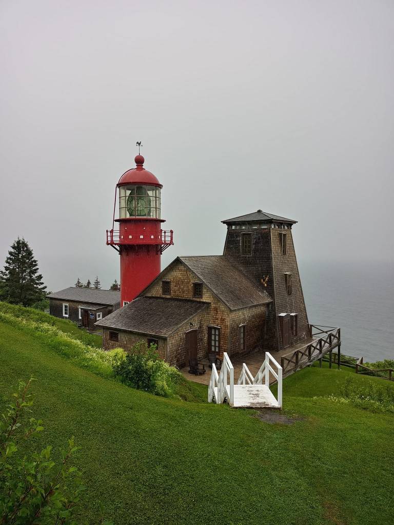 Le phare que je veux aller visiter, c’est celui de Pointe-à-la Renommée. En arrivant à proximité, après une heure et demie de route, y fait pu beau pantoute. Je décide de quand même me rendre sul site pour voir ce qu’il en est pis prendre ma décision ensuite. Le chemin pour se rendre au phare est loin d’être convivial. Y consite en quatre très longs kilomètres de gravel pis de bouette, avec des montées, des descentes pis du viraillage, tout ça avec une largeur d’un demi-char. Je suis à boute quand j’arrive finalement à destination. Je décide de visiter coûte que coûte pour pas avoir roulé dans la chnoutte pour rien. De toute façon, j’ai pas l’habitude de changer mes plans ou de reculer devant les imprévus. Le phare, je vais le visiter, qu’y pleuve ou qu’y neige. J’enfile mon imperméable pis je change de chaussures pour épargner mes HOKA. Me vla prête. ☔