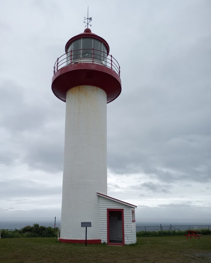 En roulant sur la 132, je tergiverse. Est-ce que je vais aller visiter mon phare ou passer tout drette ? Pour tu suite, le temps est pas si pire. Y mouillasse par boutes mais pas tant que ça. En plus, c’est ben moins brumeux qu’hier, ce qui me permet d’admirer le paysage. Quand même, je suis un peu déçue de ste mauvais temps-là. Déjà, l’an passé, y’avait pas fait super chaud quand j’étais venue en Gaspésie pis quand j’étais allée dans Charlevoix, c’était pas yable mieux. Eille, on pourrait tu avoir des étés qui ont de l’allure des fois ? 😠 J’essaie de rester optimiste malgré ce mauvais coup du sort. Je sais que je suis chanceuse de pouvoir faire ste belle expédition-là alors que des gens sont actuellement sans logement ou peinent à se faire des épiceries qui ont de l’allure. « Quand on se compare, on se console »… Vous connaissez le dicton. Après une heure de route, je fais un stop rapide dans une halte d’un village qui semble s’appeler Ste-Madeleine. Au bord de l’eau, le KONA indique 14ºC mais avec le vent, y doit faire -12. ❄️ Ironie du sort, y’a justement un phare sul site mais c’est pas celui que je convoite. Je le prends quand même en photo avant de me réfugier dans mon char pis de reprendre mon chemin.
