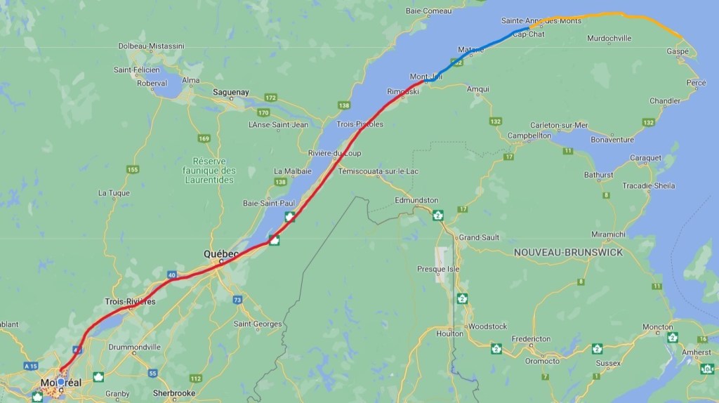 Ce qui pourrait être mieux par contre, c’est la météo d’aujourd’hui parce qu’à matin, à mon réveil, c’est pas mal gris pis ça pas l’air parti pour s’en aller. En plus, je dois rouler vers Gaspé pis là-bas, c’est carrément la pluie qui est au menu. ☔ Comble de malchance, quand je regarde à plus long terme, je vois aussi qu’à Percé, ça s’annonce pas vargeux pantoute. Bon, c’est plate mais j’ai pu ben le choix. Je repartirai certainement pas à Montréal quand toutes mes affaires sont déjà réservées. Je me croise quand même les doigts pour voir un peu de soleil d’ici mon départ prévu dimanche. Me semble qu’une seule vraie belle journée chaude, à la mi-juillet, ça serait pas un luxe. Pour tu suite, je paquete mon stock sans trop d’empressement. Mon plan du jour c’est de rouler jusqu’à Cap-des-Rosiers (170 km environ) pis de visiter un phare en chemin mais je sais pas si ça va être faisable. Aussi ben y aller mollo pour éviter d’être pognée dehors rendue là bas. 😬
