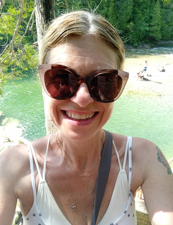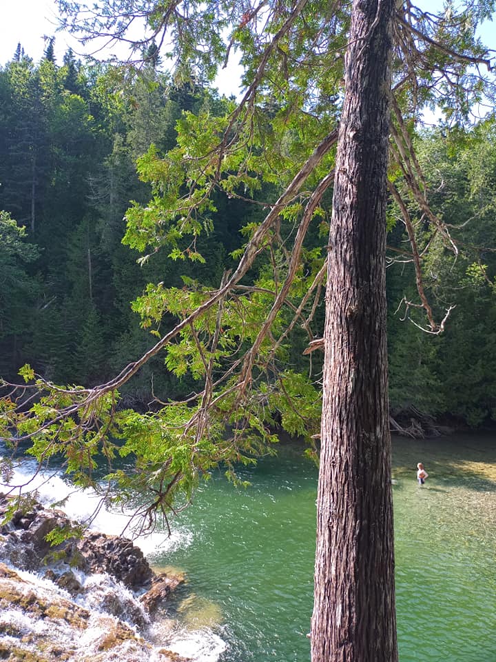 La descente par la route de gravel se révèle de la petite bière pour une marcheuse de mon calibre. Le seul hic, c’est qu’il est 13h. pis que le soleil tape sur un méchant temps. Tout un contraste avec le frette d’hier ! Tant pis, c’est sûrement pas moi qui vais m’en plaindre. Je reviens au KONA tout trempe après quasiment 9 km de marche. Me vla prête pour une autre activité. Comme y faut que je roule jusqu’à Percé, j’opte pour le Parc municipal de la Rivière Émeraude. C’est pile sur mon chemin pis l’an passé, j’ai ben aimé ça. J’y arrive une heure et quelques plus tard pis je me lance sans attendre à la conquête du petit sentier qui mène à la superbe chute. J’y passe une petite demi-heure les pieds dans l’eau avant de revenir au parking. Yé quasiment 16h. Yé temps d’aller prendre possession de ma chambre au Manoir de Percé.