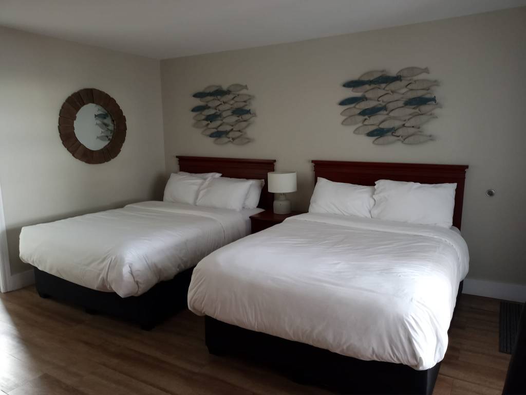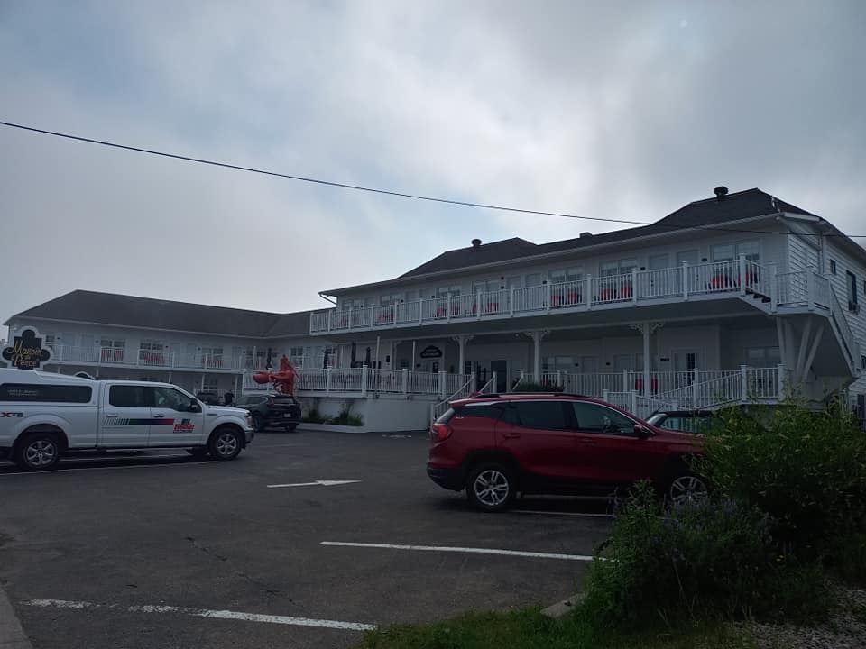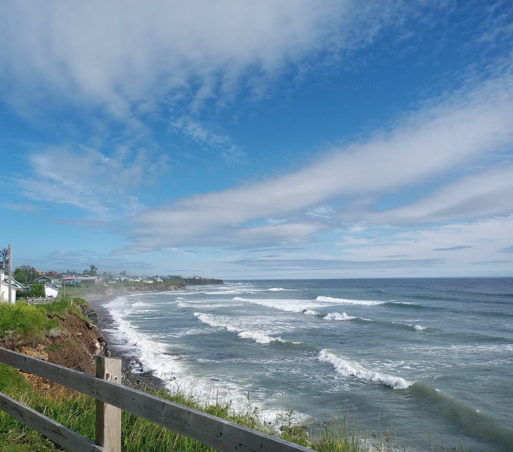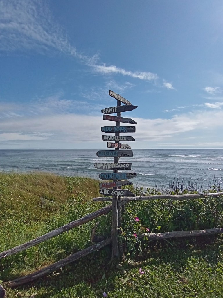 Mine de rien, voyager tu seule, c’est fatigant ! Trouver tes hébergements pis tes lieux d’intérêt (bon en Gaspésie, c’est facile), trimballer tes bagages, t’installer dans ta chambre, ramasser ta chambre, conduire des centaines de kilomètres sans personne pour prendre la relève ou au moins exercer une vigilance supplémentaire… Je vous jure que jusque là, je me suis jamais couchée ben ben tard. Y faut dire que je me lève relativement tôt aussi. À matin d’ailleurs, après une assez bonne nuit, je me lève à 7h30, trop heureuse d’apercevoir un rayon de soleil depuis la fenêtre de ma cabine. En plus, le propriétaire des lieux m’a informée hier que de 8h. à 9h., y’a du café pis des muffins à la réception. Je serais ben folle de m’en priver d’autant plus qu’autour, à part de l’eau, y’a pas grand chose. 🤷♀️