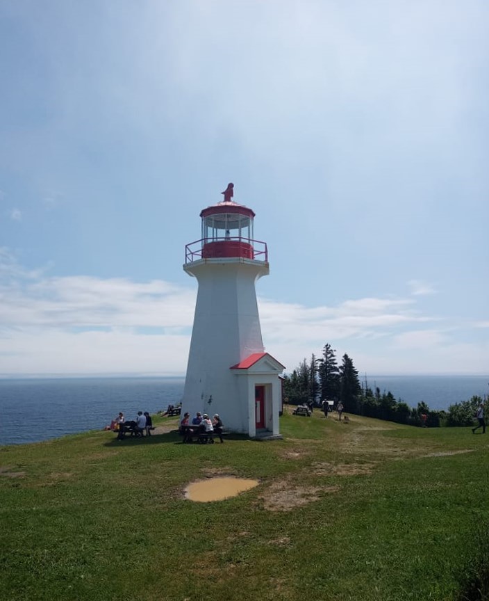 Les Spice Girls marchent quand même vite. Je suis étonnée parce que les deux sont en gougounes. Je les suis pendant 1.5 km quand arrivées à une intersection, elles optent pour la route en gravel. 😥 Pour ma part, toujours déterminée à marcher dans le sentier le plus compliqué, je décide d’attendre d’autres marcheurs. Une minute plus tard, j’aperçois un jeune couple qui s’élance dans le sentier. Ça y est, j’ai mon deuxième groupe secret. Je le baptise Ménage à trois pis je me lance à leurs trousses non sans mal. 👧👦👧 Les membres de Ménage à trois sont en forme pis rapides. Y m’attendent pas pantoute. Je peux pas leur en vouloir remarquez. Y savent même pas que je suis dans leur équipe. J’arrive quand même à les suivre pis je découvre enfin le bout du monde pis le Phare de Cap Gaspé. À st’endroit-là, la vue est magnifique, GRANDIOSE pis pratiquement impossible à prendre en photos. Je suis contente d’avoir marché jusque là. Je pourrai dire à mon père que le Parc Forillon, c’est pas tant de la marde que ça. 🙃