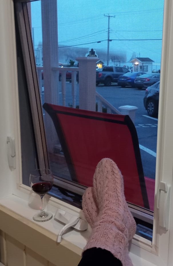 Yé finalement quasiment 20h. quand j’aperçois enfin le Rocher Percé se dessiner à l’horizon depuis la fenêtre de ma chambre. Le mercure a un peu chuté pis j’ai pu envie de resortir. Je le contemple de loin en sirotant mon petit verre de vino. 🍷 Après tout, les vacances, ça sert aussi à relaxer ! Sur mon ordi, j’ai vu mes trois gars passer offline subitement. Renaud me confirme qu’ils ont une panne d’électricité. Je présume que c’est la même chose pour Wil à Longueuil. Finalement, y faut croire que le brouillard, c’est un moindre mal. La soirée va être tranquille.