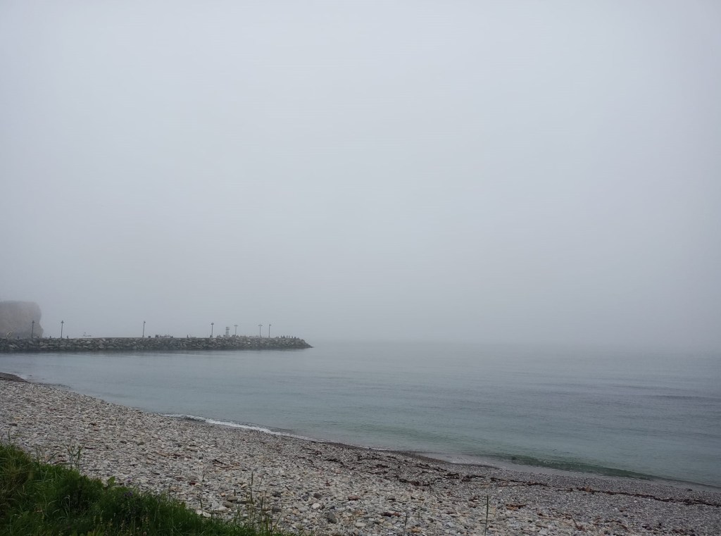 J’ai moyennement ben dormi dans ma nouvelle chambre, en grande partie à cause de l’oreiller, ben trop GROS encore une fois. Eille, y’en a HUIT dans ma chambre. Me semble qu’y pourraient en prévoir pour tous les goûts !? Bref, la nuit prochaine, je pense que je vais rentrer la p’tite couverte que je garde toujours dans ma valise de char pis je vais la plier à l’intérieur d’une taie. Je suis certaine que mon cou va me remercier de cette initiative. Pour tu suite à matin, je suis pas ultra pressée parce que j’ai pas grand chose sul programme pis que le temps est pas vargeux. À 9h., je sors quand même manger une GROSSE crêpe aux fruits au resto de mon manoir pis j’entreprends ensuite une petite marche au bord de l’eau. J’en profite pour passer un coup de fil à mon père, question de le tenir au courant de mon périple. Yé content d’avoir des nouvelles, même si je l’avais déjà appelé lundi soir, quand j’étais à Cap-Chat. On jase une vingtaine de minutes. Mon père me dit qu’il y a des avertissements d’orages violents pis de tornades dans plein de régions y compris Montréal. J’espère que Renaud a bien pensé à fermer les fenêtres chez nous.😬Ici, à Percé, c’est très gris mais y pleut pas. Le brouillard est censé se dissiper plus tard mais pour l’instant, tu peux même pas te douter que juste devant toi, y’a un ÉNORME rocher planté dans l’eau. Pour vrai, si c’était à matin ta seule occasion de le voir, ben c’est mort. ☠️