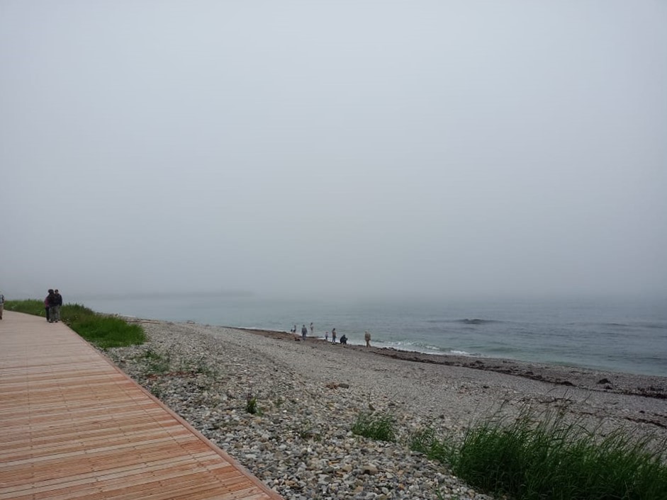 La visite pis le trajet m’occupent deux bonnes heures. À mon retour à Percé, je constate que le temps a pas évolué. On est toujours pognés dans un épais brouillard mais au moins y pleut pas pis c’est tout ce qui compte pour moi. Les activités ici, je les ai toutes faites l’an passé pis j’ai pas vraiment prévu les refaire. Si je suis revenue ici, c’est juste pour profiter du dehors pis de l’ambiance chaleureuse des vacances. Bon, c’est sûr qu’avec une vue, ça serait plus le fun mais tant pis, demain est un autre jour pis y’annonce beau. Pour tu suite, je sors prendre une marche pis j’en profite pour faire un saut à la petite épicerie pour m’acheter quelque chose pour souper plus tard, à ma chambre. En marchant le long de l’eau, je me remémore mon séjour de l’été passé pis ça me fait penser à Claude, le monsieur que j’avais rencontré sul bateau pis qui m’avait invitée à souper. Je décide de lui envoyer un courriel. 📧
