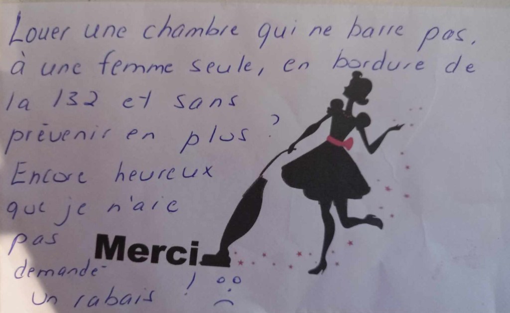 Ce matin, dans ma petite tourelle pas barrée, yé quasiment 7h. quand je me réveille. Pas plus inquiète qu’y fallait quand je me suis couchée hier soir, j’ai finalement très bien dormi. L’endroit était calme malgré la proximité de la route 132 pis pour une fois, j’avais un oreiller qui avait de l’allure. Par principe, je laisse pas de pourboire à la femme de chambre même si l’histoire de la serrure devait pas être de sa faute. En contrepartie, je laisse un petit message relativement poli pour signaler mon mécontentement. Voyons donc, plus j’y repense, moins ça a de sens st’affaire-là. T’es en voyage pis on te loue une chambre qui barre pas, sans te le dire en plus ? Pis l’autre innocent qui me répète : «Y’a pas de problème madame, y’a pas de problème». Eille, yé chanceux que j’aie été trop fatiguée hier soir pour argumenter parce que si ça avait été à matin, j’y aurais répondu que si MOI je dis qu’il y a un problème, ben Y’A un problème. Ben oui, l’établissement va prendre la responsabilité si je me fais voler. Faque quoi ? Je repars chez nous pu de téléphone, pu d’ordi, pu de portefeuille, pu de clé de char pis peut-être même pu de char mais c’est pas grave ? Maudit niaisage. Eille, j’étais pas dans un champ ciboire, j’étais sur la route ! 😡