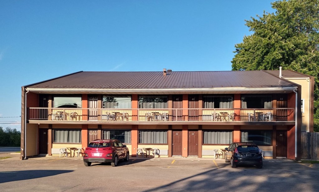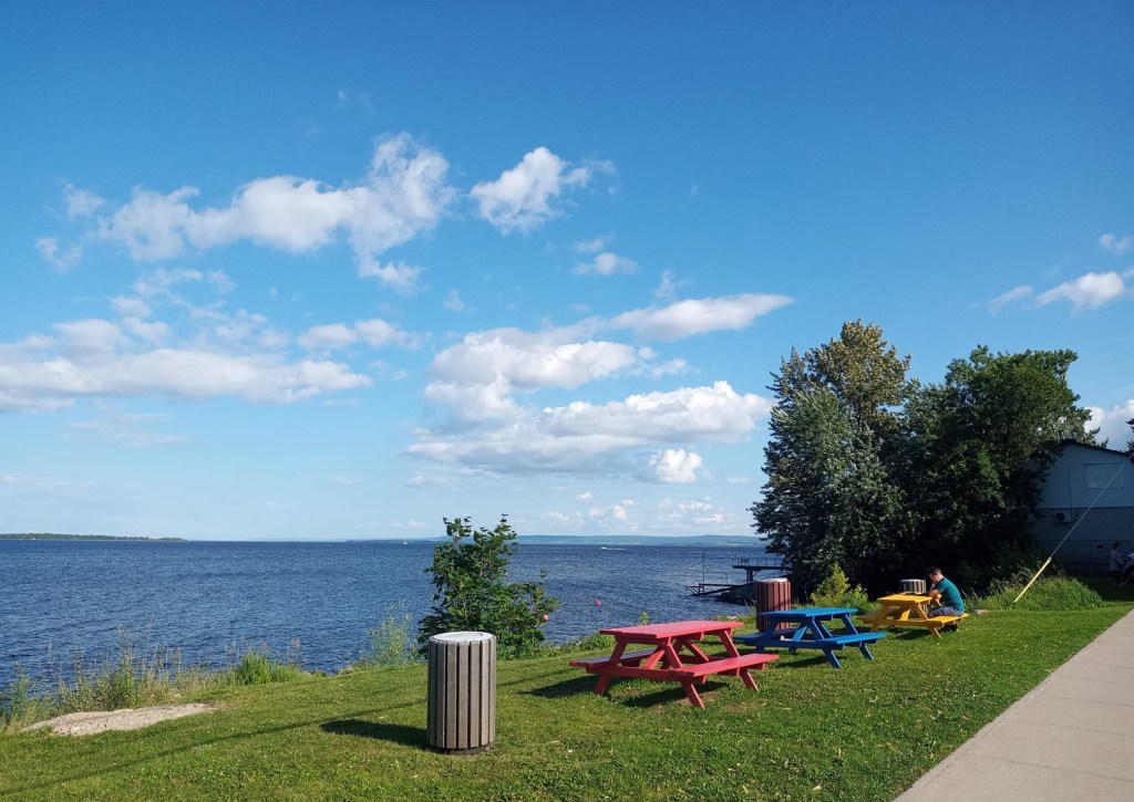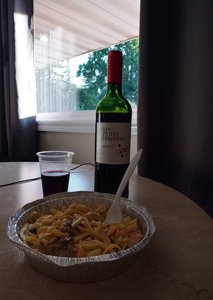 Après cette super visite, y me reste plus qu’à me rendre à mon premier hébergement, situé à peine 10 km plus loin, à Roberval. En arrivant sur les lieux, je suis agréablement surprise pis soulagée par la propreté des lieux. Bon, j’avais lu des bons commentaires sur internet mais c’était quand même pas ben cher comme chambre faque j’étais méfiante. Finalement, y’a rien à dire. Tout est impeccable. Heureusement d’ailleurs parce que j’y suis pour deux nuits. À l’heure où j’arrive, le soleil brille ardemment. C’est la PREMIÈRE fois de tous mes périples qu’y fait assez beau pis chaud pour aller profiter de la vue DEHORS en sitotant une bière. Je me peux pu. Le ciel est bleu pis le lac est magnifique. Je savoure mes vacances. À 19h., je sors m’acheter un plat pour emporter au Mike’s juste à côté. C’est pas de la haute gastronomie mais c’est réconfortant. La vita e bella. 😍 Manque plus que du beau temps pour demain…
