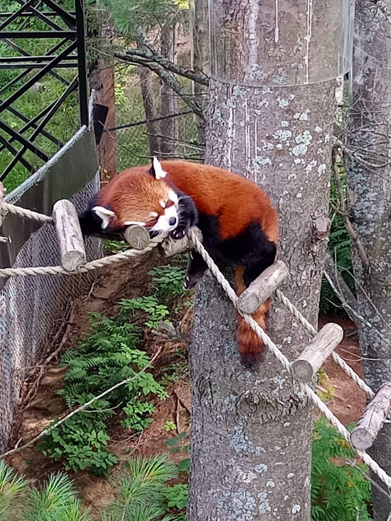 Je me demandais si c’était bizarre une adulte qui visite un zoo tu seule, sans enfants, mais je me rends compte assez rapidement que non. Partout, que ce soit dans le parking, dans la file ou dans les sentiers, je croise plusieurs visiteurs de tous âges, avec pis SANS marmots. Me vla légitimisée. 🤣 J’ai lu sur internet que la visite du site dure environ quatre-cinq heures. Je décide de la commencer avec le tour de « train » pour éviter une éventuelle file d’attente plus tard, quand l’achalandage sera à son maximum. La visite en train vaut, à elle tu seule, les 50$ déboursés pour l’achat de mon billet. Pendant une heure pis sept kilomètres, le train nous transporte au milieu d’animaux pis de décors plus captivants les uns que les autres. Au volant de l’engin, notre jeune conductrice repère les animaux qui sont cachés pis nous instruit autant sur la faune que sur les lieux. La visite est passionnante pis passe vraiment trop vite. J’essaie de prendre quelques photos mais c’est pas facile dans un véhicule en mouvement équipé d’une fenêtre à barreaux. En plus, pour prendre des photos zoomées, mon cellulaire doit ben se situer en bas de zéro sur l’échelle de Richter. 😬