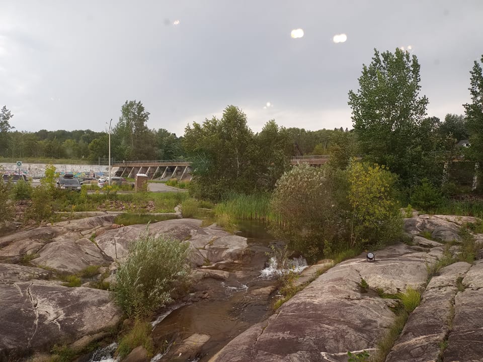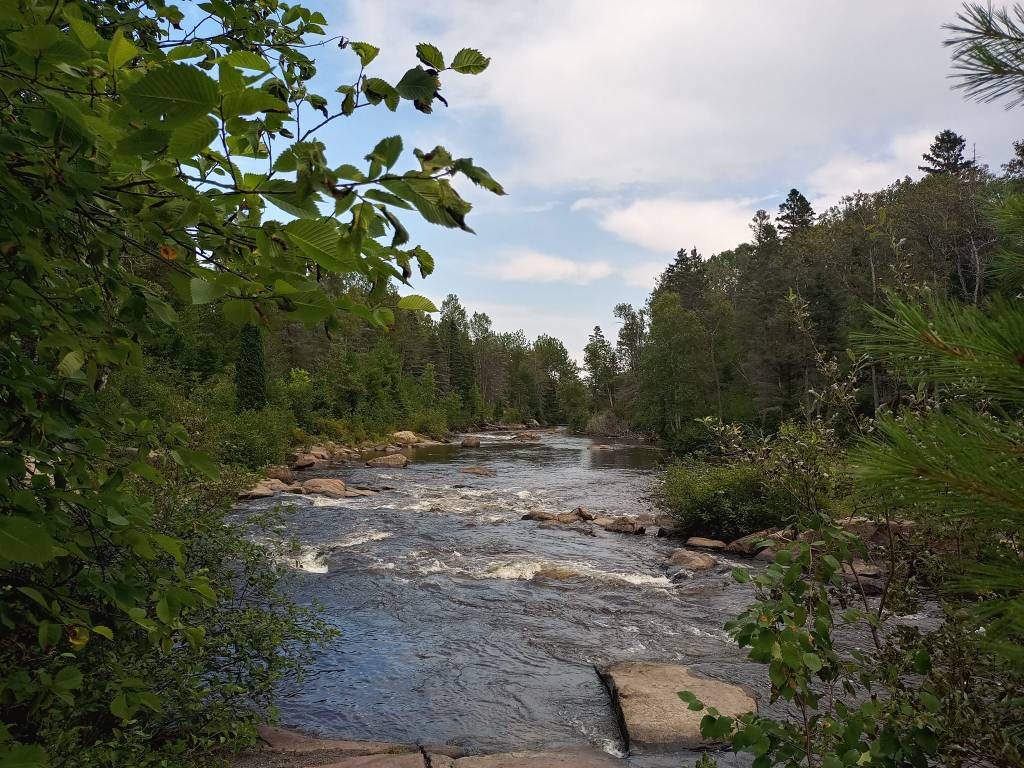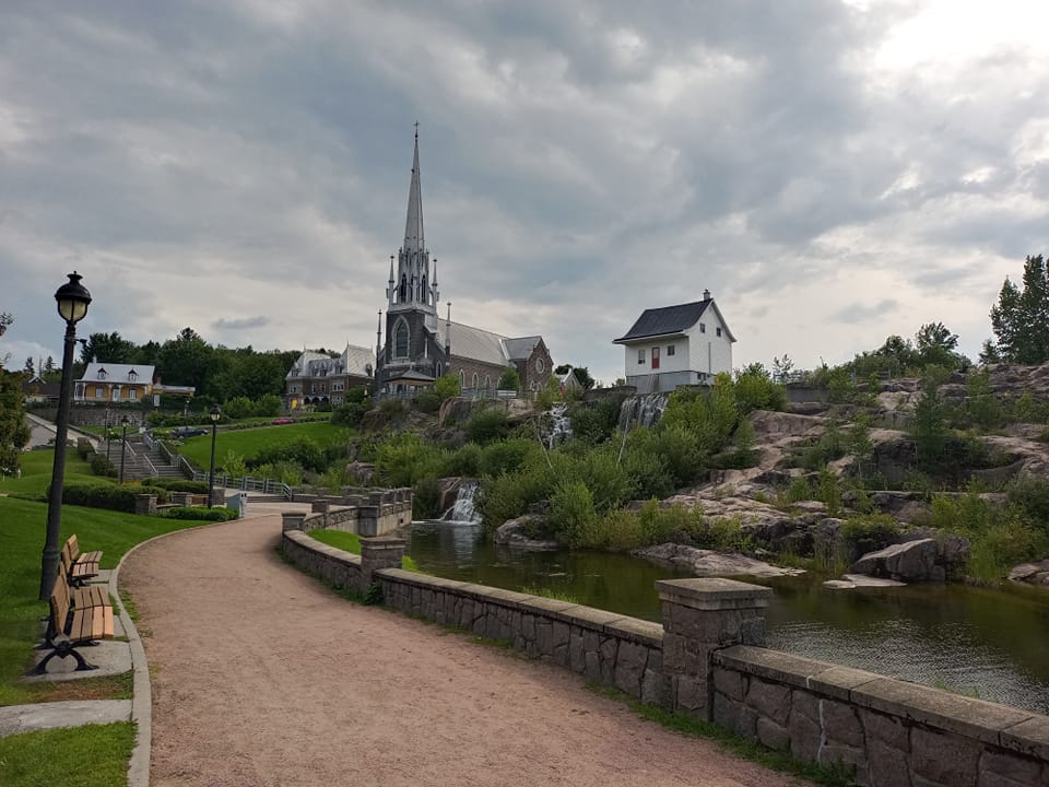 La descente vers le parking s’avère plus rapide que la montée, quoique relativement hasardeuse étant donné le dénivelé. Les 8 km de trail vers le chalet d’accueil se révèlent aussi périlleux. J’ai hâte de retrouver l’asphalte. De retour saine et sauve à Chicoutimi autour de 15h., y fait encore plutôt beau pis yé un peu tôt pour partir au Musée de la petite maison blanche. À mon avis, ste visite-là durera pas des heures pis j’ai pas envie d’aller m’enfermer dans mon auberge de trop bonne heure. Sur internet, j’ai entendu parler du Parc de la Rivière-du-Moulin, parc situé en pleine ville mais offrant plusieurs kilomètres de sentiers en forêt pis comme son nom le dit, un point de vue sur une belle rivière. Je me dis qu’une petite randonnée supplémentaire peut pas me faire de tort. Allez savoir pourquoi, je suis incapable d’envisager de juste aller m’asseoir quelque part pis d’attendre. Ça doit tu être assez plate ? On est ben trop assis dans la vie de toute façon. Le parc est effectivement très grand. Je choisis un petit sentier (2.5 km) pour m’occuper une demi-heure. À mon retour au parking, le temps commence à s’ennuager. C’est l’heure de ma dernière attraction. De toute façon, j’ai mon quota d’étendues d’eau, de rivières pis de chutes pour un petit boute. 😂