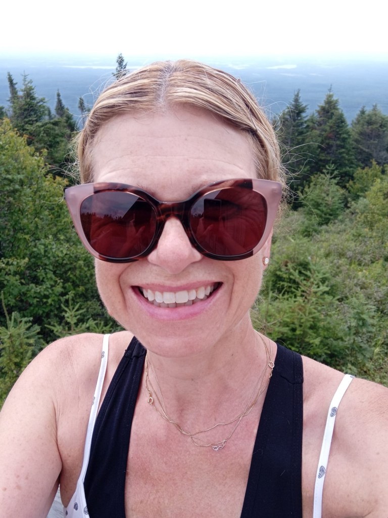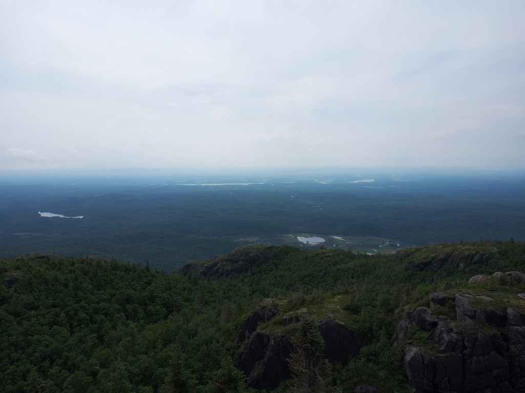 L’accès au sentier que j’ai ciblé se trouve dans un autre parking, huit kilomètres plus loin. Je reprends le KONA pis la route. Ste fois-ci, le chemin s’apparente quasiment plus à une trail. En gros, c’est de la gravel, ben des trous, des grosses roches, des montées tellement abruptes que tu vois même pas en haut pis du viraillage à profusion, tout ça, ben évidemment, dans un route ben ben étroite étrette. Le trajet me semble interminable. 😩 Regrettant mon choix, je roule archi lentement tout en m’excusant mentalement à mon char. J’aurais p’tête dû faire le sentier plus dur finalement. Ça m’apprendra à vouloir m’économiser. Je le savais que c’était pas une bonne idée de faire la moumoune. Écouter son corps, c’est pas pour moi. Écouter son char, ça me ressemble pas mal plus. 😁 J’arrive quand même à destination 25 minutes plus tard. Sans plus attendre, je me lance dans l’ascension de mon sentier parce qu’il a beau être qualifié de facile, y monte quand mème pas mal. Autour de moi, la forêt est paisible. Trop paisible. Je pense aux ours. 🐻🐻🐻 Heureusement, grâce à mes nombreuses expéditions, je sais maintenant que les ours noirs sont plutôt farouches. Si on fait un peu de bruit pour s’annoncer, un ours devrait pas attaquer, à moins de se sentir menacé. Si jamais on en croise un, ben y faut rester calme (facile à dire !) pis se tenir loin (facile à faire, fiez-vous sur moi) pour laisser à l’ours une chance de se sauver. Sur ces belles pensées-là, je poursuis mon parcours jusqu’à ce que j’arrive à un belvédère offrant un panorama unique sur le Saguenay. Mon téléphone est malheureusement incapable de capturer judicieusement les superbes images. Va falloir que je le change.