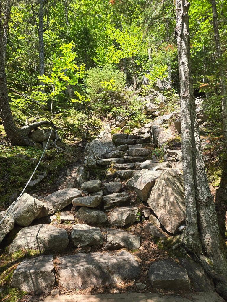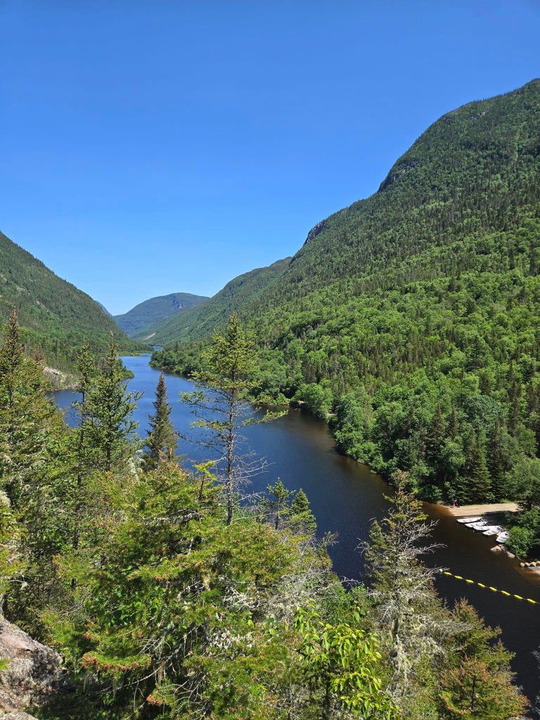 Le trajet en navette s’avère plutôt sympathique. Y’a pas grand monde dans l’autobus, la route est jolie pis le paysage est GRANDIOSE encore une fois. Les sentiers qu’on a choisis sont de niveau facile. On les a pas tant choisis pour leur niveau de difficulté que pour leur description. Niveau facile pour moi, c’est un sentier dans lequel tu peux emmener ta grand-mère ou ton enfant de trois ans. Détrompez vous. Facile ici, c’est de l’escalade dans des roches mouillées parsemées des vestiges de bouette de la pluie d’hier. On monte heureusement sans trop de difficultés nos deux sentiers. Le premier « Le Belvédère » offre vraiment une vue impressionnante de la vallée, de la rivière pis du Barrage des Érables. Le deuxième sentier apporte cependant rien de nouveau sauf quelques possibilités supplémentaires de se péter la yeule. 🚑 La vue d’en haut doit être jolie quand les arbres sont dénudés mais aujourd’hui, on voit rien pantoute. On reprend la navette en sens inverse pis on quitte le parc sans trop s’éterniser. On est attendus ailleurs.