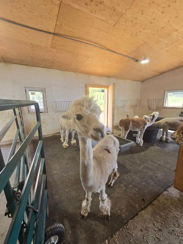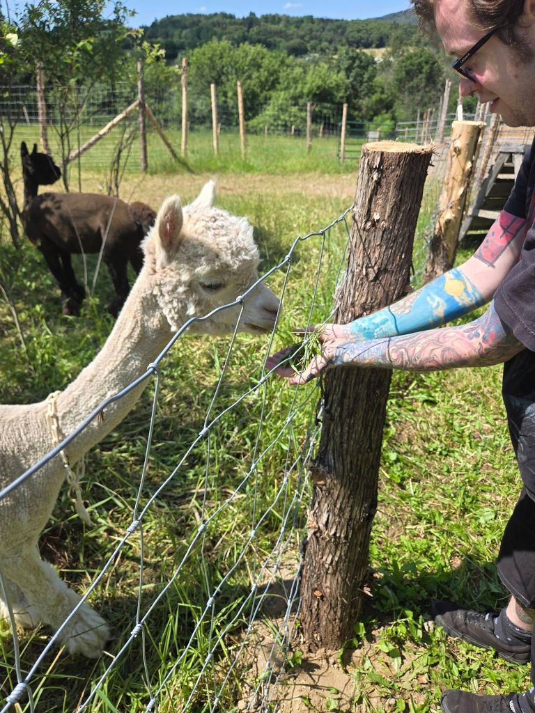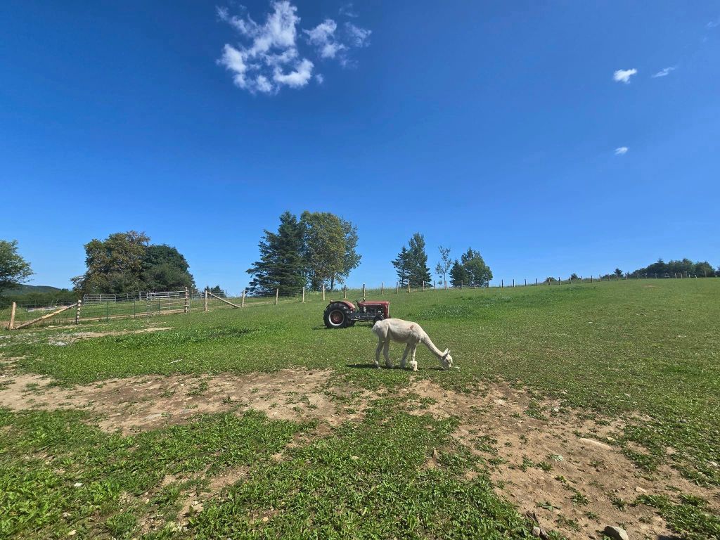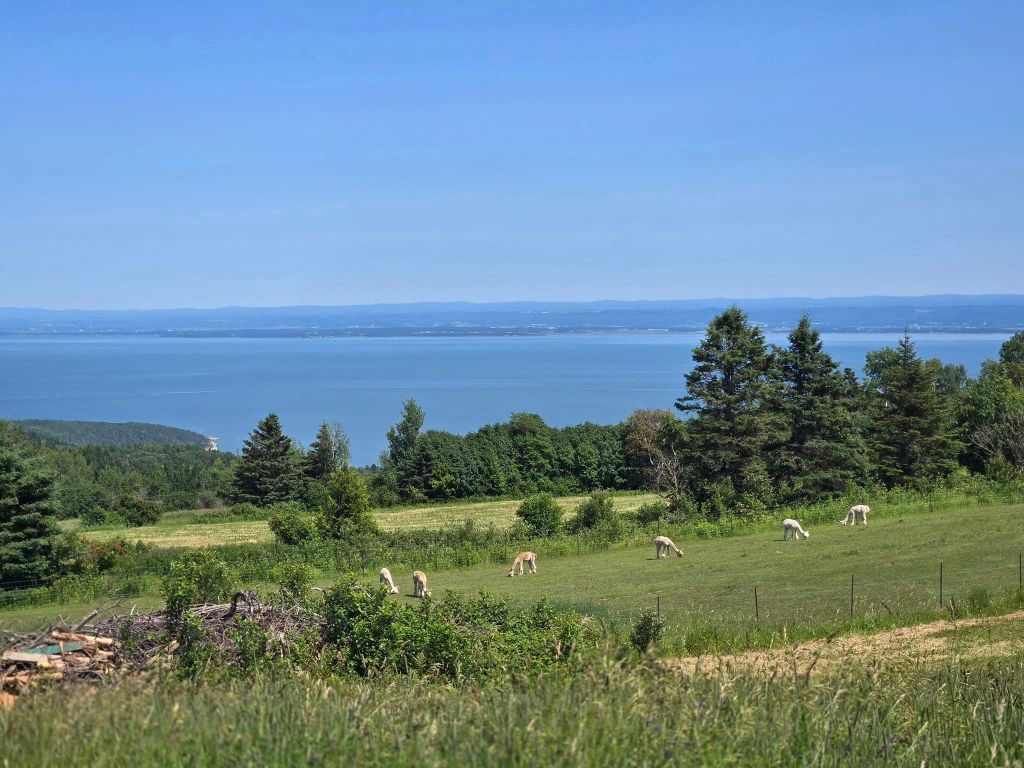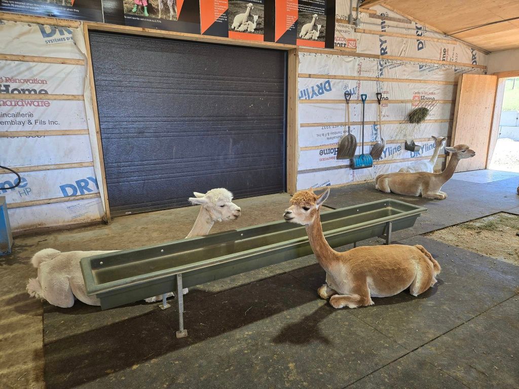 La deuxième activité à notre programme, c’est Alpagas Charlevoix. 🦙 On y est déjà passés en juin 2023 mais William veut y retourner, notamment pour s’acheter du jerky d’alpagas. Yé déjà 14h30 quand on arrive là-bas. Nouveauté cette année chez les alpagas, le site a déménagé en face de l’ancien. La vue offerte le long du parcours est beaucoup plus dégagée pis attrayante mais les alpagas ont encore la même face. On fait quand même le tour pour les regarder pis leur donner à manger (on a le droit). En passant, je dis qu’ils ont encore la même face mais c’est cute un alpaga. Y faut pas confondre ça avec un lama, animal pas mal moins gâté par la nature pis ben moins sympathique. Dans la fermette d’Alpagas Charlevoix, y’a quand même une lamate, répondant au nom de Chocolatine. Dans les faits, elle répond à absolument rien. Elle reste couchée dans le champ, au milieu des alpagas qui gambadent joyeusement, sans jeter le moindre regard à qui que ce soit.