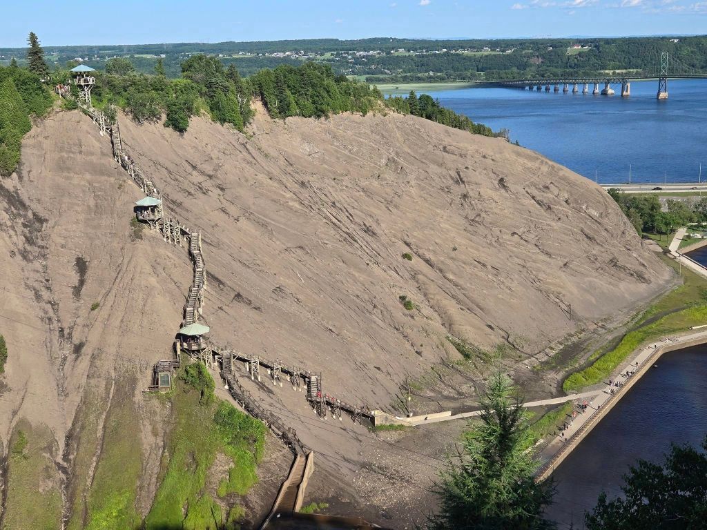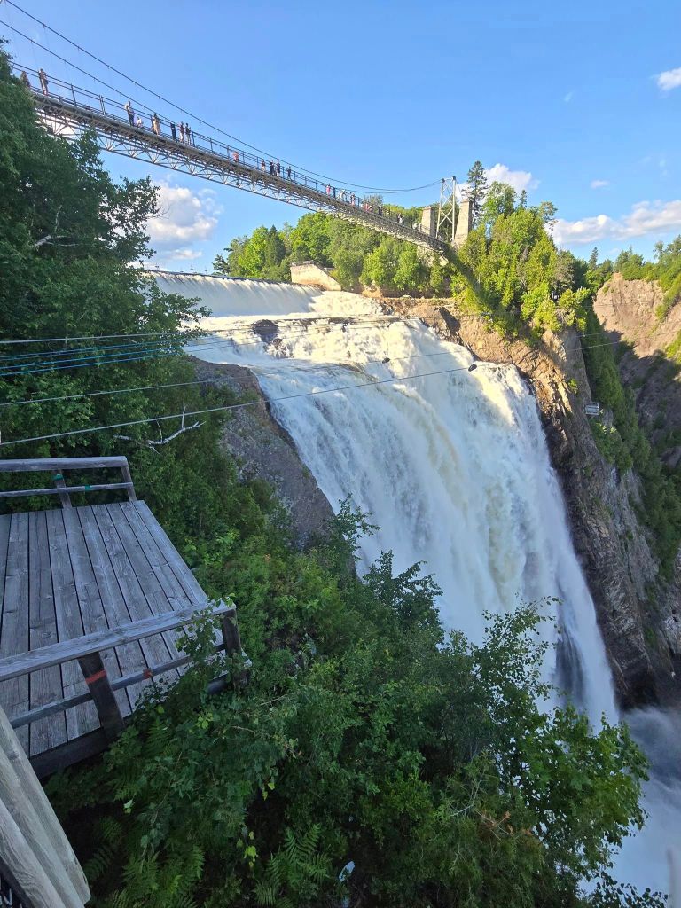 16h., on rembarque dans le char, direction Chute Montmorency. À cause du temps « perdu » au parc national, yé plus tard qu’on voulait faque on s’est pas accordé de temps pour dîner. William mange un boute d’alpaga dans l’auto (berk) pis moi j’attrape un sundae dans une crèmerie sul bord du chemin. En approche de Québec, sur la 138, y’a pas mal de traffic. De toute évidence, les gens rentrent en ville après le long week-end. La Chute Montmorency, je l’ai visitée de nombreuses fois mais William est jamais allé. C’est vrai que la seule fois que j’ai emmené les héritiers là-bas, y’était pas avec nous autres. Aujourd’hui, le site ferme à 18h30 avec dernière remontée du téléphérique à 18h15. On arrive largement d’avance pour profiter de la montée, emprunter la passerelle au-dessus de la chute pis redescendre par les 427 marches. De retour en bas, je mentiras si je disais que je commence pas à être un tit peu fatiguée de ma journée pis de ma fin de semaine au complet. William, lui, semble en GRANDE forme. Comme on a encore 250 km à rouler, au décide de reprendre la route sans trop tarder. On mangera chacun chez nous quand on arrivera à Montréal.