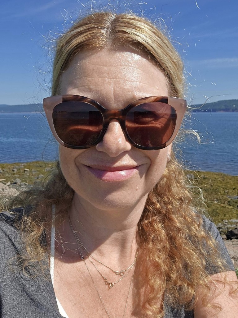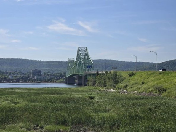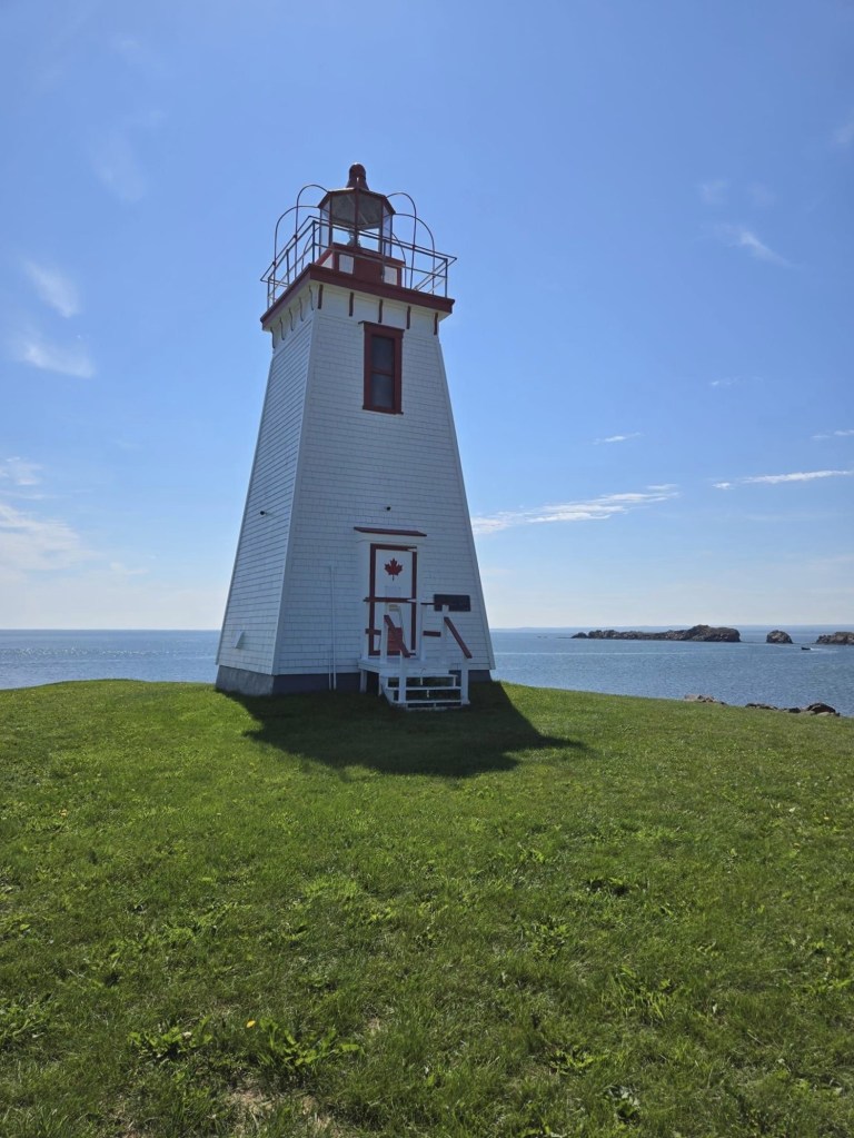 En partant de Mont-Joli, j’arrête à la commande à l’auto du Tim pour attraper café-croissant pis j’en profite pour gazer mon char au passage. On est jamais trop prudent quand on roule en territoire inconnu. Toujours est-il qu’il est finalement 7h. quand je prend la 132 vers la Vallée de la Matapédia. L’été passé, j’ai emprunté ste chemin-là dans le sens inverse pis j’ai trouvé ça plate à mourir. Cette année, c’est tout le contraire. Le paysage me semble magnifique. Est-ce que c’est dû à l’orientation de la route ou au fait qu’à matin y fait GROS soleil tandis que l’autre jour, j’étais dans la grisaille pis le brouillard ? Est-ce mon humeur qui est plus joyeuse comparativement à l’an passé quand ste chemin-là sonnait la fin de ma semaine en Gaspésie ? Y’a probablement un peu de tout ça. Quoiqu’il en soit, la route est belle pis le temps aussi, si bien que j’aboutis en temps et en heure aux portes du Nouveau-Brunswick, après un dernier petit pipi québécois dans la halte à proximité. 🚺 À partir de ste point-là, y faut que je fasse attention pour pas me retrouver soit dans la route potentiellement fermée, soit dans le détour de 100 km. Pour être certaine que Google me fasse prendre le trajet que j’ai élaboré, j’ai programmé comme destination un phare qui va l’obliger à me faire suivre le chemin que j’ai choisi. En arrivant au dit phare, je m’arrête pour admirer le panorama en mangeant mon croissant. Franchement, y’a pire décor pour manger une collation.