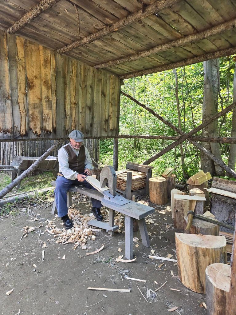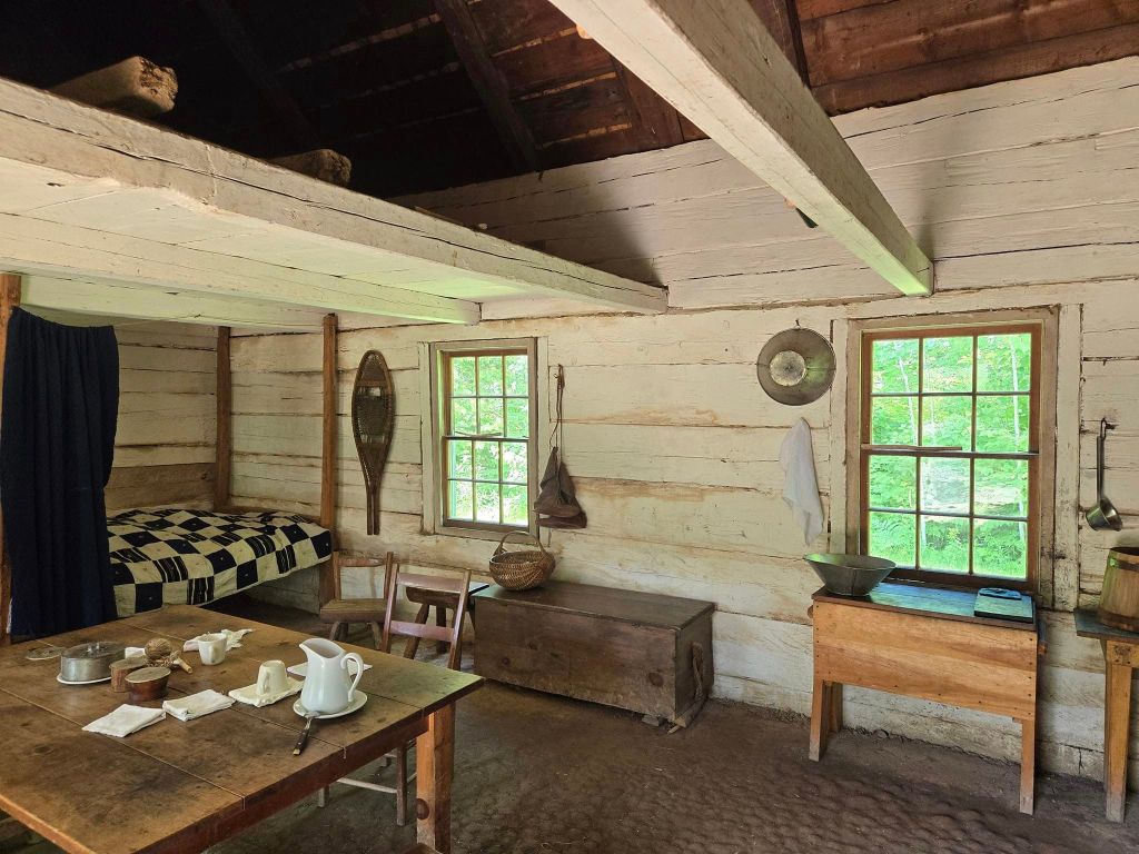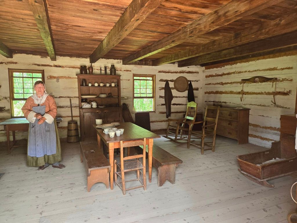 La madame est contente mais en débarquant de son char, elle se rend compte qu’y fait chaud en estie. 🥵 Oui, j’avais pourtant vu l’avertissement de chaleur à matin mais on dirait que j’y croyais pas. Dans le parking, deboute sur l’asphalte, avec un ressenti de 38°C, j’y crois subitement. Soucieuse de pas cuire bord en bord ou de pas pogner de coup de chaleur, je me badigeonne généreusement de crème solaire (j’hais ça !), j’attrape ma bouteille d’eau pis je pars à la conquête de l’Acadie. La visite du Village s’avère complètement captivante. Chacune des maisons du site est une vraie maison d’acadien qui se trouvait auparavant quelque part dans la province. Plus passionnant encore, dans chacune des habitations, y’a un guide, en costume d’époque, qui nous explique exactement qui vivait dans la maison, quel métier excerçait le père de famille, combien y’avait d’enfants, etc. Les guides sont bilingues. Quand je suis toute seule avec eux-autres, j’écoute la présentation en français. Quand y’a des anglophones qui rentrent en même temps que moi, j’écoute la version en anglais. Selon l’accent du guide, yé parfois plus facile à comprendre en anglais qu’avec sa parlure francophone. Chose certaine, je leur lève mon chapeau de travailler habillés de même par une chaleur pareille. 🏅 Les hommes sont vêtus de salopettes, de chemises, de berrets pis de grosses bottines. Les femmes, elles, portent plusieurs épaisseurs de robes pis des foulards sur la tête. En plus, dans chacune des maisons, y’a un feu (un vrai) allumé dans le foyer. 🔥 Laissez-moi vous dire que c’est loin d’être frisquet.