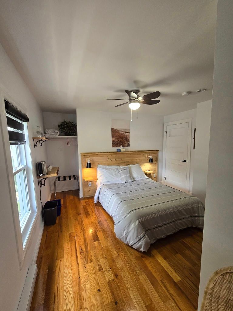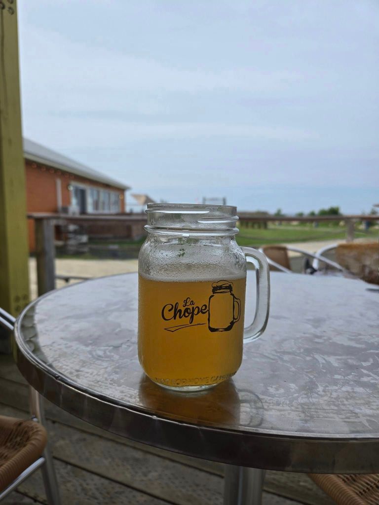 En quittant le Village, je me dirige directement vers mon hébergement du jour, situé à seulement 7 km plus loin. Comme c’est un genre de gîte avec entrée autonome pis que j’ai toujours peur de rester pognée dehors, je m’empresse d’aller faire mon check-in pendant qu’il y a encore des secours sur place. La chambre que j’ai louée est située dans une mignonne petite auberge administrée par un monsieur fort sympathique. Le seul hic, c’est que j’ai pas de vue sur l’eau pis que je dois prendre mon char pour aller manger. Là, yé rendu pas loin de 18h., je suis brulée pis j’aspire juste à aller chercher n’importe quoi à l’épicerie pour manger dans ma chambre. Mais bon, y faut ben que je m’avoue que c’est un plan de marde. Je m’en rends compte moi-même en m’écoutant exposer mon projet à Guy, le tenancier de la place. Eille, je suis à Caraquet, avec un beau bord de mer à proximité, pis ça fait six mois que je compte les jours pour venir ici. Je peux quand même pas me confiner dans ma chambre, si cute soit-elle. Y’a toujours ben des limites à l’absurdité. Pis à part ça, depuis quand je suis trop fatiguée pour faire des affaires ? Pis c’est quoi 5-6 km de plus comparativement au 1000 que j’ai roulés depuis hier matin ? Quinze minutes plus tard, je sirote une bière sul bord de l’eau. 🍺 Une maudite bonne bière frette. Une bière vraiment désaltérante. Une bière qui m’abrutie instantanément tellement le soleil tape encore. 🌞