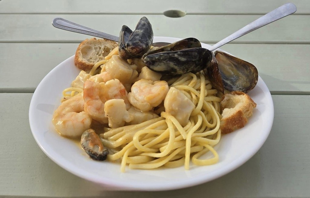 Saoule mais encore plus affamée, je me commande des pâtes aux fruits de mer ÉCOEURANTES que je dévore, toujours au Quai de Caraquet. Ça me redonne un peu de pep pour marcher sur la promenade avant de rentrer au bercail. Je suis contente d’être finalement sortie. J’ai bien bu, bien mangé, bien marché. De retour à mon gîte, je coupe l’air climatisé pis j’ouvre la fenêtre de ma chambre. Dehors, j’entends quelqu’un jouer de l’accordéon dans la cour de mon auberge. Je m’endors là-dessus. Moment parfait. 😍