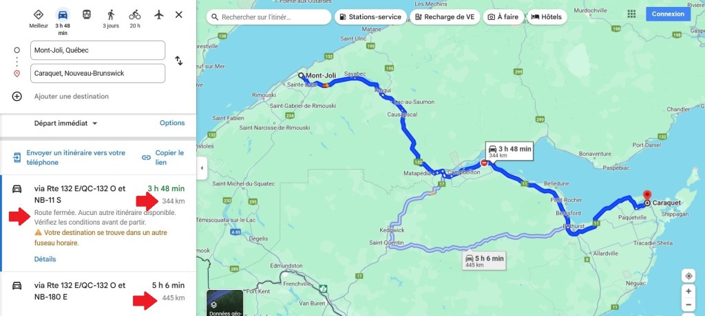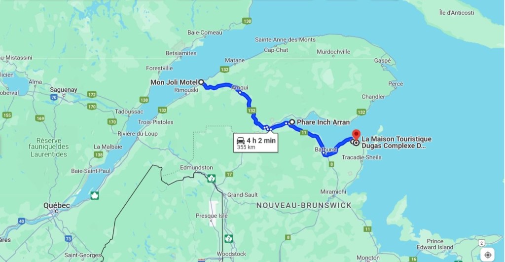 Je dors profondément quand mon alarme sonne à 6h. à matin. Dans Mon Joli motel d’ailleurs, je dors toujours bien mais chaque fois, y faut que je me lève tôt pour m’en aller quelque part. Aujourd’hui, mon scénario fait pas exception à la règle. Y faut que je roule jusqu’à Caraquet parce que c’est là que je dors à soir. Ça, ça représente environ 350 km de route (4.5h.) + au moins un arrêt en chemin. En plus, je veux absolument aller visiter le Village historique acadien pis au travers de tout ça, y faut que je calcule que je vais perdre une heure de ma journée à cause du décalage. Inutile de dire que j’ai pas le temps de niaiser. Heureusement, j’ai bien récupéré d’hier pis je me sens en pleine forme faque je me lève comme si le feu était pogné dans mon lit pour paqueter mes petits tout en siphonnant un jus d’orange dans une boîte à boire. À 6h45, je suis dans mon char. Ouin, ça a l’air long de même mais j’ai quand même passé une couple de minutes à l’ordi pour checker la météo pis mon chemin. Aller là-bas en tant que tel, c’est pas compliqué mais quand j’ai regardé mes affaires la semaine passée, Google map m’annonçait que la route entre Mont-Joli pis Caraquet était fermée pis qu’il y avait pas d’autre itinéraire possible. En même temps, ce même Google map me proposait un autre itinéraire (???) 100 km plus long. Eille, je dis pas, 5 ou 10 km, on fera pas de caprices pour ça, mais 100, ça commence à faire une petite trotte. Bref, comme je trouvais ça irréaliste, je me suis patenté moi-même un autre chemin faque là, fallait que je le regarde comme il faut pour pas me ramasser dans un détour signé Google. 😬