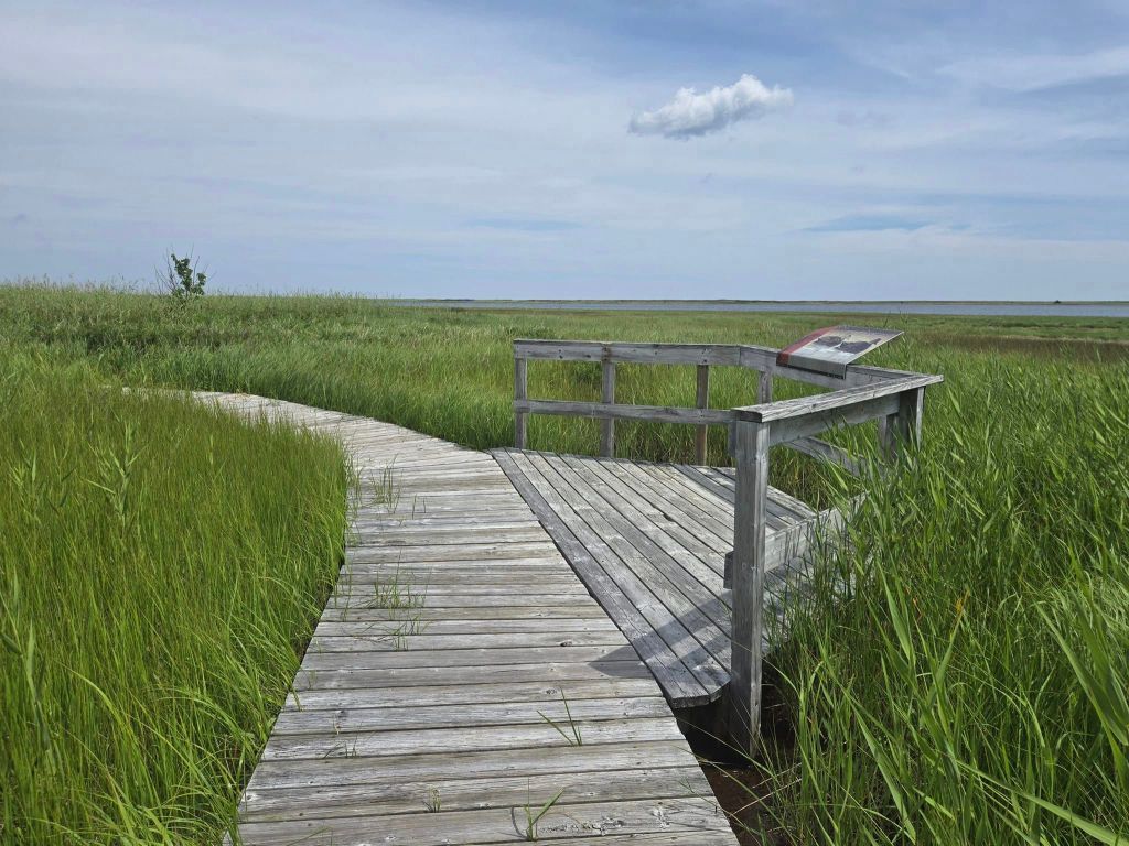 Avec tout ça, j’arrive au Parc national Kouchibouguac à 12h. pile. Ce qui est le fun avec les parcs nationaux, c’est que ça coûte pas cher faque c’est pas ben grave si tu restes pas longtemps. Aujourd’hui, y fait aussi chaud qu’hier sinon plus. Hier soir, j’ai regardé le plan du site pis y’a deux sentiers qui m’intéressent : « Le marais salé » pis « La promenade de la plage Kellys ». Concernant « Le Marais salé », sur internet, il est indiqué ceci : « Voici l’occasion rêvée de visiter – les pieds bien au sec – un endroit humide, détrempé, infesté de maringouins, que peu de gens auront la chance d’explorer. » Ça l’avantage d’être clair. Est-ce que j’ai envie de me dégonfler ? Oui ! Est-ce que je vais me dégonfler ? Oh non ! Moi je l’ai déjà dit, quand j’ai prévu faire quelque chose, je le fais, à la vie à la mort. Anyway, j’ai même pu de surface corporelle piquable. Au cas où, je m’enduis généreusement de mon super chasse-moustiques lavande–citronelle. Advienne que pourra. C’est juste une boucle de 700 mètres. Quoique, si je fais un prorata avec l’attaque subie à la halte routière, sur 700 mètres, ça pourrait représenter 1026 piqûres… En me lançant dans le sentier, je croise des gens qui en resortent pis qu’y semblent plutôt bien portants. Ça me donne le courage de m’y engager à mon tour. Dans le meilleur des cas, mon chasse-moustiques va fonctionner pis je vais être contente de mon achat. Dans le cas contraire, je saurai que je me suis fait arnaquer. Quinze minutes plus tard, bilan de l’expédition : sentier relativement plate pis AUCUN moustique en vue dans le marais. Beaucoup d’émotions pour pas grand chose. 🤦♀️