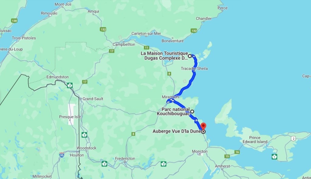 Je pense que j’ai jamais si bien dormi hors de chez nous pis peut-être même chez nous. Pour vrai, tout était parfait dans mon petit gîte de Caraquet, que ce soit la quiétude des lieux, la douce brise qui s’inflitrait par la fenêtre de ma chambre ou le super confort du lit. Comme quoi, y’a pas besoin d’aller absolument dans des grands hôtels pour passer un agréable moment. Toute bonne chose ayant malheureusement une fin (j’hais ste dicton-là), je me lève autour de 8h. pour préparer mes affaires pis organiser ma journée. Aujourd’hui, j’ai « seulement » 225 km à rouler. Une aubaine par rapport aux deux jours précédents. En quittant mon gîte, à 9h., je fais un premier stop essence dans une station ESSO pis je passe au Tim pour m’acheter un muffin pis un café. Au Tim Hortons, y doit bien y avoir cinquante chars à la commande à l’auto. Je décide d’aller commander à l’intérieur dans l’espoir de gagner du temps. La stratégie s’avère payante. Y’a un seul client avant moi. Au moment de payer ma commande, CATASTROPHE, je trouve pu ma VISA. Eille, me semble que c’est ni la place ni le moment pour perdre ma carte de crédit. Bon au pire, j’ai toujours ma carte de débit mais y faudrait au moins que je fasse les démarches pour annuler ma VISA, sans compter tous les bonidollars perdus d’ici la fin de mon périple. 💲💲💲