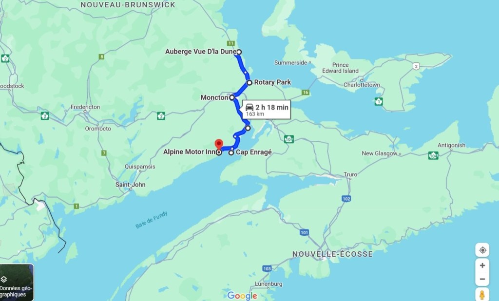 J’aurais eu une dernière attraction à visiter, le Parc national de Fundy, mais je suis plus trop certaine d’en avoir envie. Ste parc-là, yé à 300 mètres de mon hébergement du jour faque je prends la décision d’aller d’abord faire mon check in pis de zieuter les alentours. 👀 Si jamais y’a moyen de profiter du dehors au motel, c’est là que ça va se finir pour aujourd’hui. Le motel, yé à environ 30 km du Cap Enragé. Je suis soulagée de constater, tandis que je roule, que le brouillard pis le temps gris étaient restreints au cap. Demain par contre, j’y échapperai pas. Pis malheureusement, je pense qu’y fera pu beau de la semaine. 😢 On verra dans le temps comme dans le temps. À soir, c’est à Alma que je dors. En arrivant au motel, je découvre un petit bout de rue sympathique avec restaurants, un bord de l’eau qui a ben de l’allure, pis une chambre ben correcte malgré sa déco douteuse. Ça, ça me dérange pas. C’est souvent de même dans les petits motels ou les auberges. Moi, tant que je dors pas encore avec des papillons, ça va ben aller.