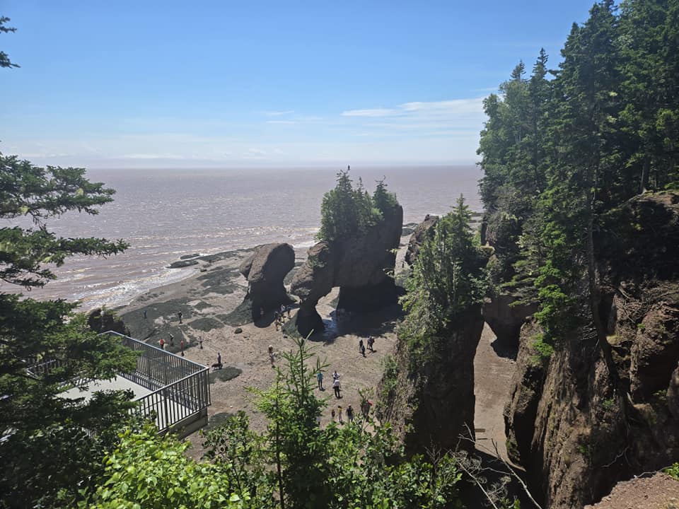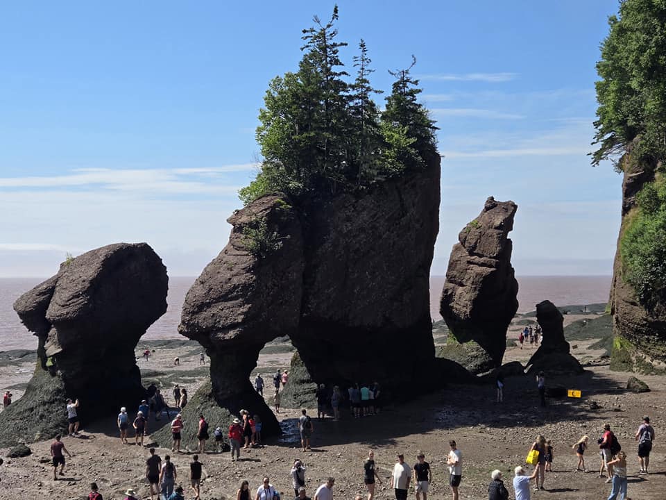 Saviez-vous ça que c’est ici, au Nouveau-Brunswick, qu’ont lieu les plus hautes marées au monde ? Eh ben oui mesdames et messieurs, ces marées-là sont hautes de 16-17 mètres pis elles surviennent dans la Baie de Fundy, plus précisément au Parc provinciale des rochers Hopewell. Dans ste parc-là, selon l’heure à laquelle tu te pointes, tu peux admirer les rochers à marée basse pis même marcher autour, sur le fond marin, ou voir le phénomène à marée haute, quand les rochers sont à moitié immergés. Évidemment, y faut que tu planifies ta visite selon l’heure des marées. Le best, c’est de voir les deux cas de figure. Si jamais c’est pas possible, y faut définitivement aller voir ça en marée basse. Au pire, tu peux revenir plus tard ou le lendemain parce que ton billet d’entrée est valide deux jours, exprès pour te donner la chance de comparer la vue selon les marées. Pour ma part, demain, je serai déjà pu dans le boute faque j’opte pour la marée basse. Bon, des roches c’est des roches pis j’en ai déjà vu. En arrivant sur la « plage » par contre, je suis complètement subjuguée, impressionnée, fascinée, flabergastée par la beauté pis l’immensité du site. 🤩🤩🤩 Eille, juste pour ça, ça vaut la peine de rouler jusqu’au Nouveau-Brunswick. À matin en plus, y fait super beau. J’en profite pour prendre des photos pis admirer le formidable décor. Pour vrai, c’est juste malade ! Deux heures après mon arrivée les patrouilleurs commencent à vider la plage. La marée va commencer à monter, sur plusieurs heures, faque on peut pas rester là. Je m’en retourne à mon auto, en me demandant qu’est-ce qui pourrait ben m’impressionner ici après ça.