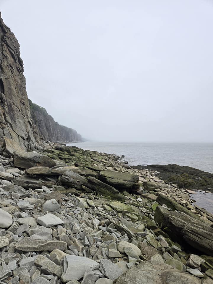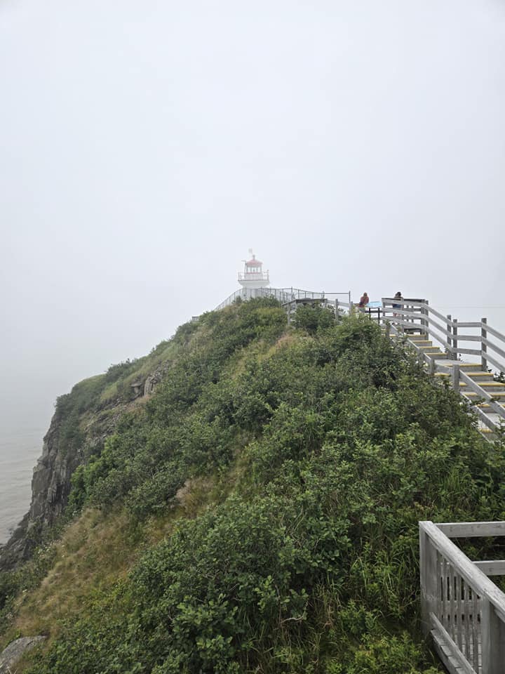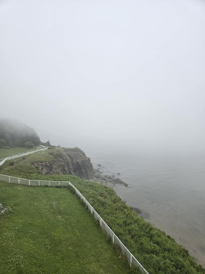 Ce qui pourrait m’impressionner, c’est le Cap Enragé, situé 35 km plus loin, toujours dans la Baie de Fundy. Là bas, t’as les mêmes marées qu’aux rochers Hopewell mais d’un point de vue différent. Y’a aussi un beau phare pis pour les plus téméraires, y’a possibilité de faire du zipline pis de la descente en rappel le long de la falaise. 35 km, c’est pas loin, mais j’ai pourtant l’impression de rouler vers le bout du monde, dans des routes plus creuses les unes que les autres, sans aucun signal GPS. Plus j’avance d’ailleurs, plus je ressens une petite inquiétude parce que non seulement je croise pratiquement pas de chars mais en plus, y’a un brouillard de plus en plus épais qui se forme. Sur mon tableau de bord, je constate qu’on est passé de 28°C tantôt aux rochers à 17° ici. Je commence à douter de mon choix d’attraction pis de mon chemin. Je me sens tu seule au milieu de nulle part, sans indications ni visibilité mais yé comme trop tard pour virer de bord. Pis bon, je roule sur une route qui s’appelle Cap Enrage Road. Je me dis que c’est forcément de bonne augure. Justement au sommet d’une énième côte, abrupte comme la face de singe, la guérite du site surgit devant moi tel un mirage en plein désert. Eille, je vous dis, je pense que j’ai jamais été aussi contente de voir un humain, même si yé unilingue anglophone. 🤣