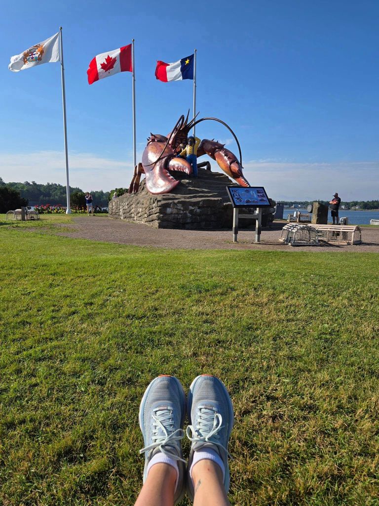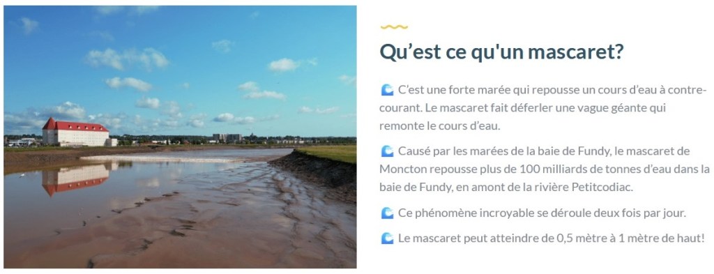 Aujourd’hui, tout comme hier, j’ai pas tant de route à faire mais j’ai plusieurs attractions en vue. Mon premier arrêt, je le fais à Shediac, au Parc Rotary. Ici, on peut admirer la sculpture d’un homard GÉANT de plusieurs tonnes, officiellement le plus GROS homard au monde. 🦞 Ste homard-là, c’est l’attraction la plus photographiée du Nouveau-Brunswick. Comme je l’ai vu cent fois en photos depuis que je prépare mon périple, j’avais pas le choix de venir le voir de mes propres yeux pis de prendre quelques clichés moi-même. Ma mission accomplie, je repars vers Moncton, une trentaine de kilomètres plus loin. À Moncton, ce qui m’intéresse, c’est le mascaret. Bon, le phénomène est un peu dur à expliquer pour une novice comme moi mais en gros, c’est un événement qui survient deux fois par jour, à heure précise, selon les marées (explication plus bas). Aujourd’hui, le mascaret avait lieu à 1h02 du matin pis à 13h15. Le problème c’est que là, yé même pas 10h. faque y faudrait que j’attende plus de trois heures sur place, tout ça pour voir une vague de trois-quatre minutes. L’autre problème, c’est que si j’attends le mascaret, je rate mon autre attraction. J’hésite un peu, je tournaille autour du site pis finalement, je passe mon chemin. J’aime vraiment mieux aller voir les rochers Hopewell pis ça, c’est 25 km plus loin.