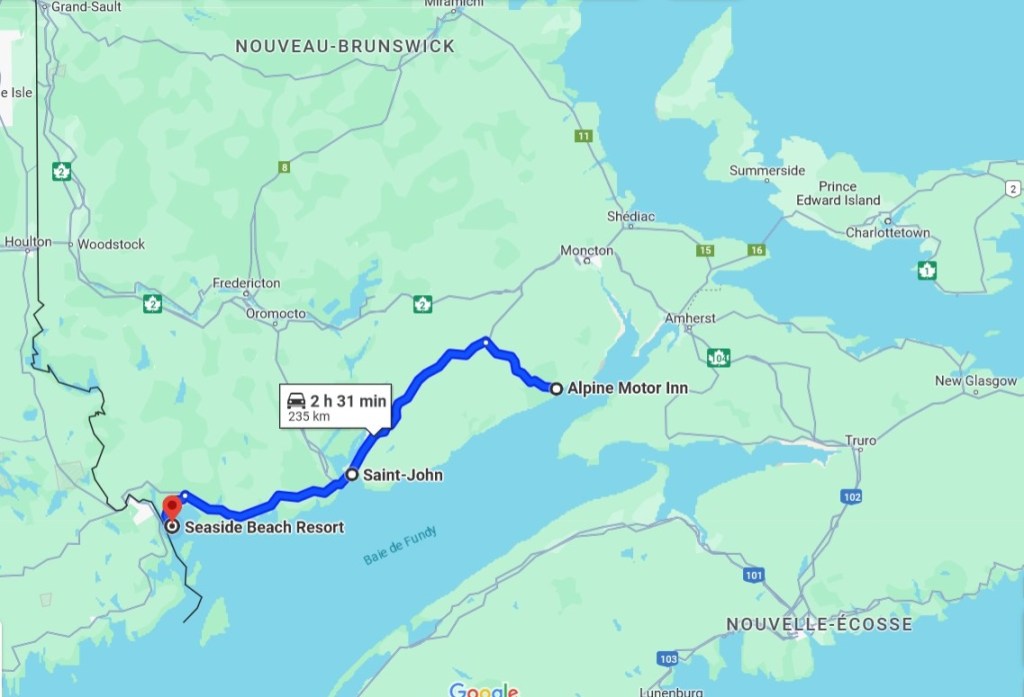Je quitte ma chambre autour de 10h., par un temps nuageux. Aujourd’hui, j’ai environ 235 km à expédier avec une pause dîner prévue à Saint-John. Les 75 premiers se font au travers du Parc national de Fundy. Par beau temps, je pense que ça doit être joli en certains endroits. À matin par contre, on voit pas grand chose à part du brouillard. Au moins, la pluie est pas encore commencée. C’est toujours ça de pris. La pluie justement, elle se déchaîne pile quand je sors du parc, pis pas rien qu’un peu. 🌧️🌧️🌧️ Les 60 km restants avant d’arriver à Saint-John sont plutôt pénibles. Y pleut tellement que j’ai l’impression de rouler dans un lave-auto, savon en moins. Heureusement, ici les gens me semblent plus prudents que chez nous. Sur l’autoroute, limitée à 110 km/h., les chars roulent à 80-90. Je comprends asteur pourquoi les gens des autres provinces nous appelent les crazy quebecers. D’ailleurs, depuis que je suis ici, chaque fois que j’ai vu un char rouler en fou ou effectuer une manoeuvre douteuse, c’était un québécois. 🤔