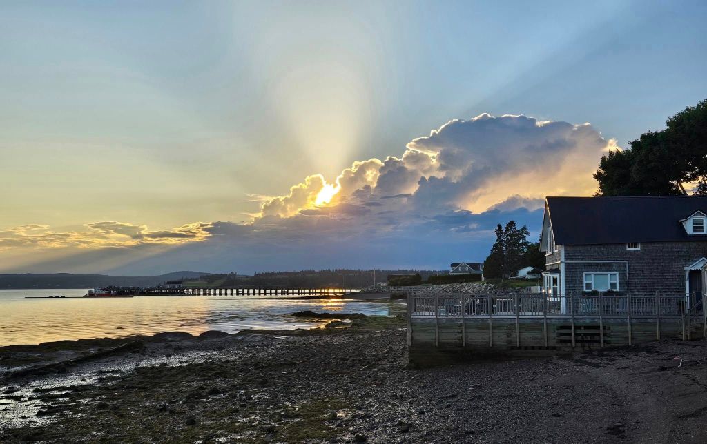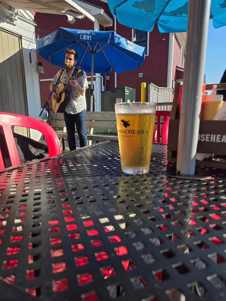 De retour à mon motel, y fait trop beau pour s’enfermer mais j’ai déja marché 13 km aujourd’hui. Je me dis que c’est peut-être le temps que je profite un peu du site pour lequel j’ai payé. Ici, y’a de quoi s’asseoir pis y’a un accès à l’eau où on peut marcher à marée basse. Par contre, tout ça est plein soleil pis ça tape pas à peu près. Au bout d’une heure, j’estime qu’il est plus sage de me soustraire aux rayons. J’ai pas envie de troquer mes démangeaisons de maringouins contre des coups de soleil. En plus, j’ai faim. Hier soir, y faisait pas trop beau faque j’ai mangé dans ma chambre. À soir, je compte bien manger dehors pis profiter un peu de l’ambiance de l’endroit. En marchant sur la Water street, mon attention est attirée par un chansonnier sur une terrasse. 🎶 Bingo, c’est là que je vais manger. Au menu, lobster roll accompagné d’une bonne bière frette pis d’une vue sur la mer. 🦞 🍺 Je savoure mes derniers instants ici. C’était superbe mais c’est pas à la porte. Je sais pas si j’y reviendrai un jour. 🤷♀️