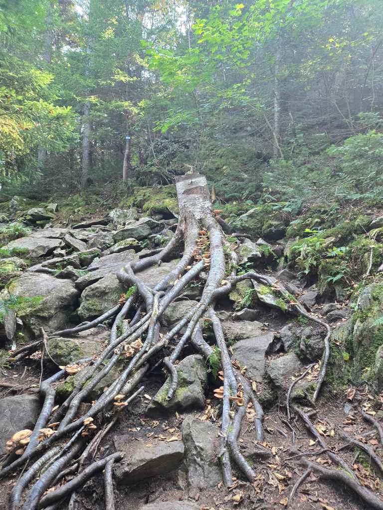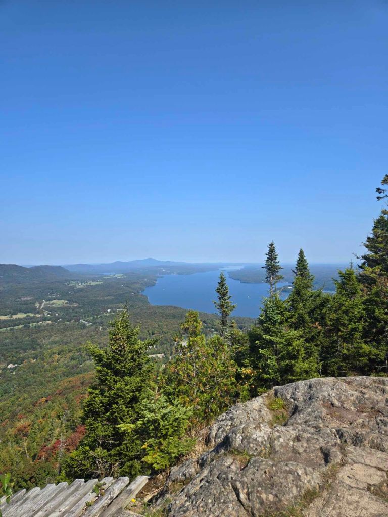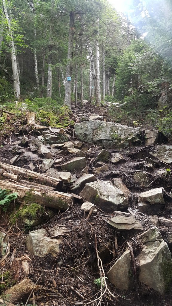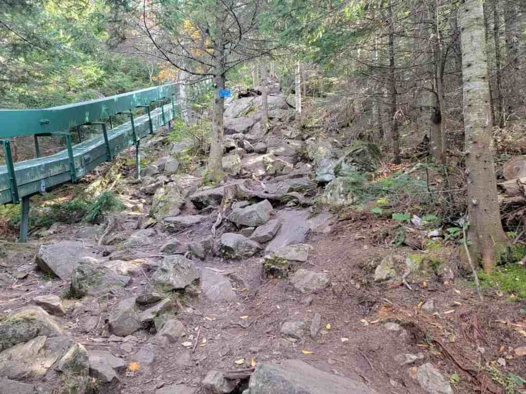 Les derniers kilomĂštres pour rejoindre le Mont Owls Head se font sur des petites routes qui offrent des jolis paysages. Encore un nouveau coin que je dĂ©couvre. Franchement, au QuĂ©bec, on est quand mĂȘme gĂątĂ©s point de vue panoramas. Ceux qui disent le contraire sont certainement pas sortis des grandes villes. YĂ© finalement autour de 10h15 quand on arrive Ă destination. On distribue les lunchs pis les bouteilles d’eau dans nos sacs Ă dos avant de se badigeonner de crĂšme solaire pis de chasse-moustiques. Ă 10h45 pile, on se lance courageusement Ă la conquĂȘte de la montagne. đȘ Les premiers mĂštres du sentier me rassurent. Ăa a pas l’air plus compliquĂ© qu’y faut de monter lĂ -dedans. Je me dis que les 2.4 km Ă marcher pour se rendre au sommet vont ĂȘtre vite expĂ©diĂ©s. AprĂšs tout, la marche, c’est ma spĂ©cialitĂ©. En plus, hourra, Ă premiĂšre vue, y’a pas vraiment de moustiques. Tout va pour le mieux dans le meilleur des mondes. đ