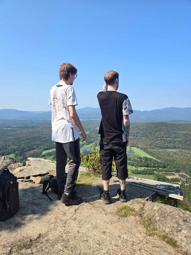 AprĂšs des efforts considĂ©rables, on atteint enfin les trois quarts de la montĂ©e, autour de midi. Ă cette hauteur-lĂ , y’a un petit boute de roche oĂč on peut s’asseoir pour manger. Selon Renaud, c’est Ă s’t’endroit-lĂ que la vue est la plus belle. Plus qu’au sommet mĂȘme. Bon, j’ai pas encore vue le top de la montagne mais c’est vrai qu’ici, le paysage est vraiment magnifique. On voit LARGE, on voit HAUT pis on voit GRAND. De toute beautĂ©. đ€© Par contre, l’espace pour s’installer est limitĂ© pis absolument pas sĂ©curisĂ©. Heureusement, on est tout fin seuls sul caillou. Les autres marcheurs doivent ĂȘtre morts en chemin. â ïž Avec les hĂ©ritiers, on s’installe pour manger, face Ă toute cette superbe IMMENSITĂ. Franchement, ça valait vraiment la peine de souffrir pour voir ça. D’ailleurs, je me demande mĂȘme pourquoi aller plus haut puisque Renaud dit que c’est ici que c’est beau. đ€ Mais bon, Ă©videmment, le fameux mont, on va le grimper au complet. Pour l’instant, je profite de la petite pause pour reprendre un peu d’Ă©nergie tout en savourant le plaisir de passer du temps avec les hĂ©ritiers. En plus, y fait SUPER beau. đđđ