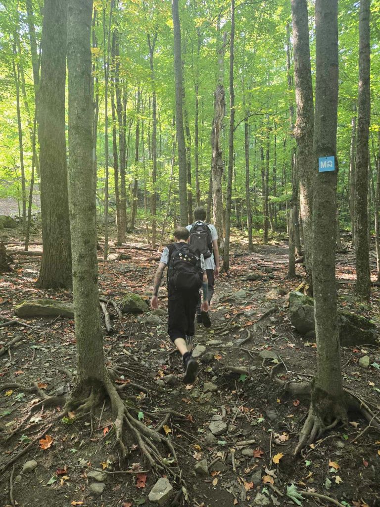 Faque oui, la marche c’est ma spĂ©cialitĂ©, mais l’escalade non pis c’est pas mal la tournure que prend notre expĂ©dition aprĂšs peut-ĂȘtre deux cent mĂštres. đŹ Ouin, finalement, c’est peut-ĂȘtre pas si facile que ça ste montĂ©e-lĂ . Devant nous, le sentier se transforme en un amoncellement de roches, de trous, de racines pis de troncs d’arbres parmi lesquels y faut avancer, en MONTANT Ă©videmment. En plus, Renaud pis moi on s’est mis en pantalon pour Ă©viter de se faire piquer pis lĂ , y doit faire 30ÂșC Ă l’ombre. đĄïž Les sacs Ă dos aident pas non plus mĂȘme si on a juste apportĂ© le minimum. Mais bon, ça m’en prend plus pour me dĂ©courager. J’ai dit que j’allais monter pis je vais monter. Pour tu suite, les hĂ©ritiers gambadent agilement devant pis moi, je maintiens un pas pire rythme mĂȘme si je ralentis un peu. Je reste optimiste mĂȘme si Renaud me rĂ©pĂšte que lĂ , on est dans la partie facile. Eille voyons donc. Y veut sans doute me faire peur pour que je trouve ça drĂŽle rendu en haut. đ€