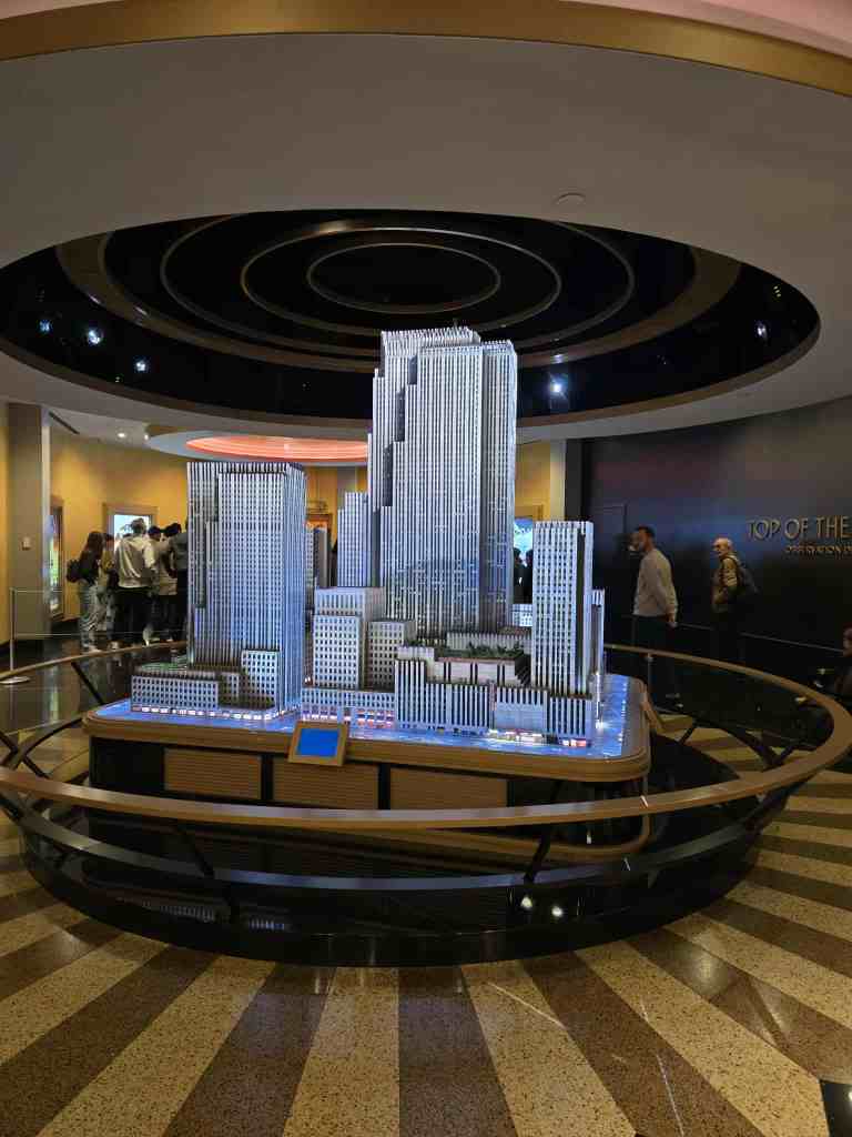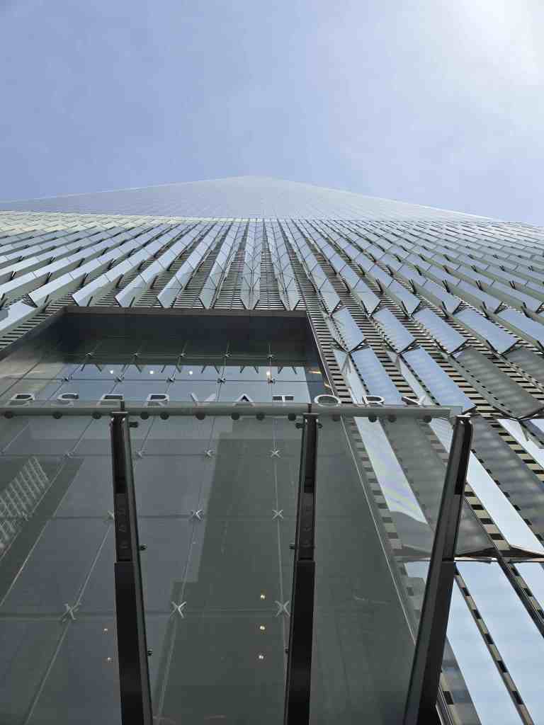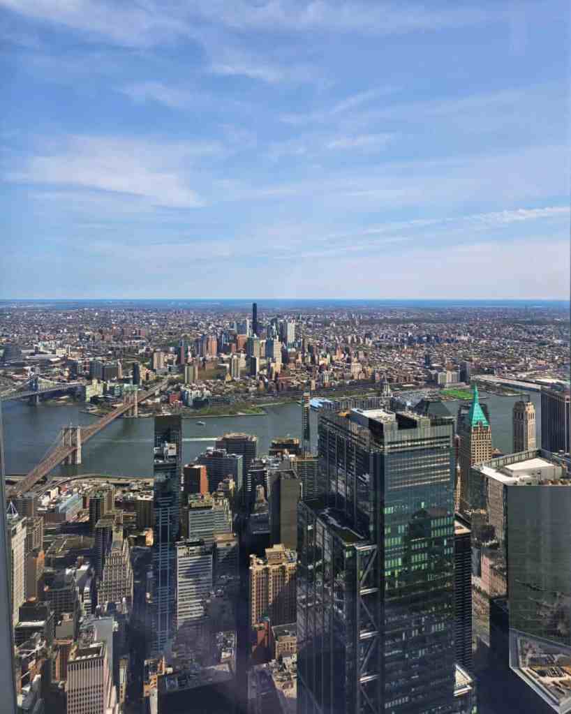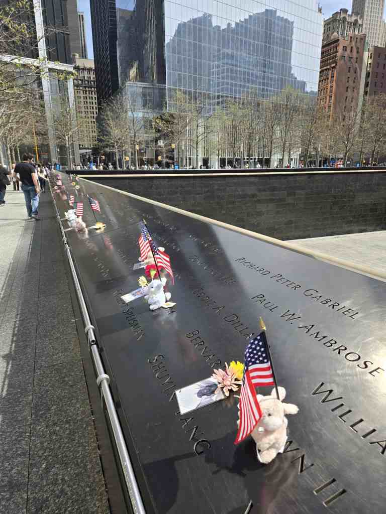 Le prochain point d’intérêt, au programme de la journée, en est un incontournable. Il s’agit évidemment de Ground Zero. ✈️ On s’y rend comme toujours en autobus Hop-on-Hop-off pis franchement, on est rendus pas mal efficaces depuis qu’on a compris le principe. 🏆 Le site de Ground Zero est impressionnant non seulement par les deux trous (bassins) représentant les anciennes tours jumelles mais également par les noms des victimes gravés tout autour pis évidemment par la présence de l’IMPOSANT One World Trade Center, un gratte-ciel comme j’en ai évidemment jamais vu. 😮 Avant de monter à l’intérieur, j’en profite pour déposer un de mes cailloux sur une petite colonne près des bassins. Est-ce que je le verrai passer sur la page Facebook des trouveurs de roches ? On sait jamais. 🤷♀️ La visite du One World Trade Center débute elle aussi par une petite animation qui, sans le savoir, est diffusée sur des espèces de stores qui se soulèvent à la fin pour offrir une vue sur la ville. Le panorama est sensationnel mais le pire, c’est qu’on est même pas encore rendus tout en haut. Le tout en haut, lui, yé au 102ième étage. Ça, c’est vraiment fou. Encore ici, on a droit à une vue spectaculaire de tous les côtés de la ville pis même de la statue. Moi qui suis jamais venue ici avant, je constate vraiment l’ampleur du drame qui est survenu comme ça, drette devant nous. Pour vrai, tout ça est vraiment saisissant. 😧
