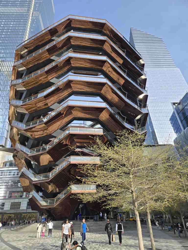 En sortant du One World Trade Center, on reprend le bus pour se rendre au Edge Observatory. Cette fois-ci, l’attente est plus longue. Le premier bus qui passe est un Express qui s’en va directement à Times Square. Comme notre attraction est à un autre STOP, on peut pas le prendre. Les deux bus suivants sont là pour faire demi-tour pis repartir dans l’autre sens. Ça, on savait même pas que ça se pouvait. Ça nous sera utile une prochaine fois. Le quatrième bus est enfin celui qui nous emmène à destination. On a ben dû attendre trois quarts d’heure. ⏳ On commence à être fatigués de la journée. En arrivant au Edge, les explications pis les modalités sont moins claires que dans les tours précédentes. Quand je présente mes billets à la petite madame, elle m’explique en anglais qu’y faut quand même passer par les guichets à l’entrée pour sélectionner une heure de visite. En m’exécutant, je constate que la machine veut me charger 20$ US par personne alors que je détiens déjà des billets pour la visite. On fait signe à un employé à proximité qui nous baragouine quelque chose de pas clair. Je comprends qu’y semble dire que nos billets marchent pas quand c’est le « sunset ». 🌇 Je cherche mes mots pour lui dire qu’aucune mention de ce type figure sur mes billets mais je sais pas trop comme m’expliquer. Morgan prend les choses en main d’un ton autoritaire pis le monsieur nous donne des billets sans qu’on débourse quoi que ce soit. 🙃
