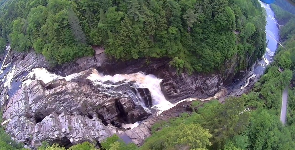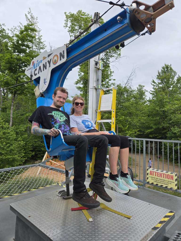 En quittant la halte, on décide sur un coup de tête de s’arrêter au Canyon Sainte-Anne. La dernière fois qu’on est allés là, c’était avec Renaud pis Morgan, en 2014. On avait fait de la via ferrata pis de la tyrolienne, la plus haute de tout le Canada, à l’époque. Aujourd’hui cependant, nos projets sont de moindre envergure. On veut juste profiter de l’occasion pour se dégourdir un peu dans un joli site avant de rouler jusqu’à Montréal. En payant nos accès à l’entrée du parc, notre attention est toutefois attirée par une activité qu’on connaît pas : le air canyon. Sur la photo de promotion, deux personnes sont installées ensemble, tout sourire, dans un genre de télésiège. L’activité a définitivement l’air plus relaxe que la tyrolienne. 🥱 On s’achète chacun un billet sans s’informer davantage du concept. Nous autres, un petit parcours aérien pépère, ça fait complètement notre affaire.