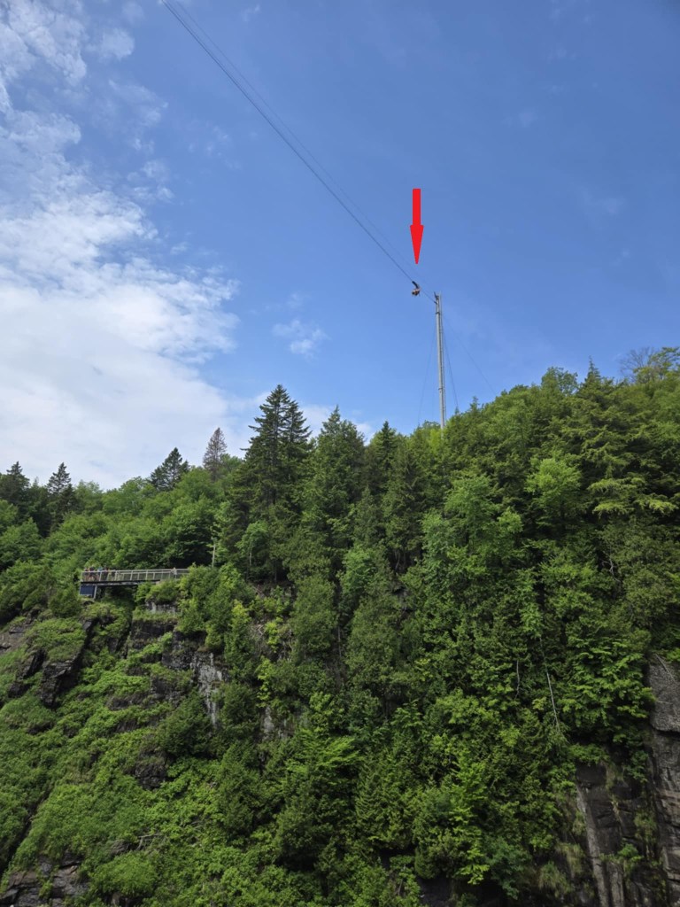 50 km/h…. me semble que c’est lent quand on roule en char… 🤔 Eh ben détrompez-vous. Quand tu descends de 90 mètres en quelques secondes au-dessus d’une chute pis d’un gouffre, c’est vite en estie titi. ☄️ Mais le pire, c’est pas la descente mais l’ARRIVÉE. Parce que quand t’approches l’endroit où t’es sensé t’immobiliser, tu comprends assez vite que l’arrêt se fera pas en douceur pantoute. 🥴 Pire encore, tu dépasses le point d’arrêt pour te diriger dramatiquement vers la structure métallique pis tu recules ensuite à la bonne position. De l’adrénaline, en voulez-vous, en vla ! On descend du télésiège complètements ahuris, incertains d’avoir nos organes encore aux bons endroits. Ouf ! Méchante petite ride ! Cela dit, la vue du haut sur le canyon, ça valait le coup ! 🤩